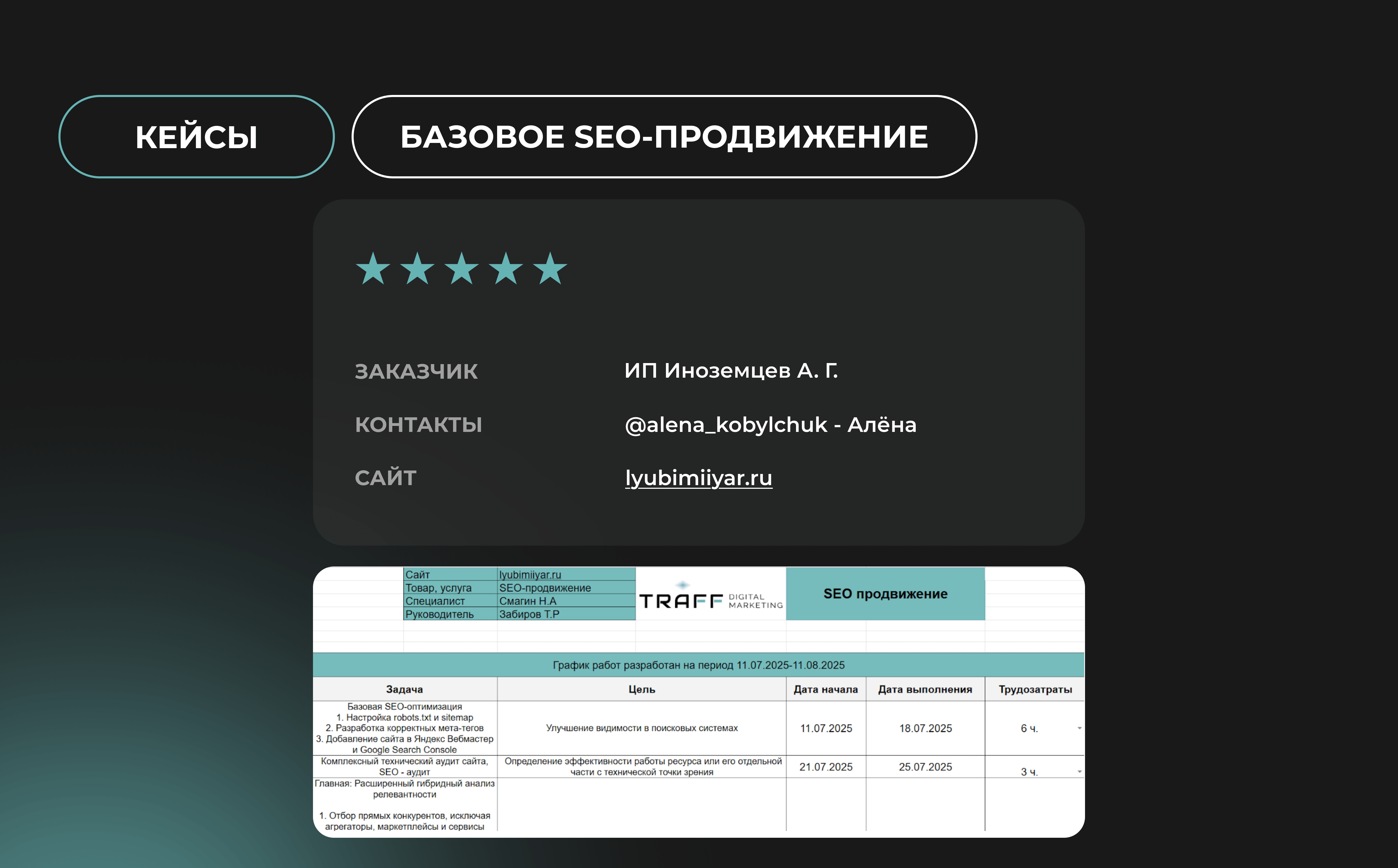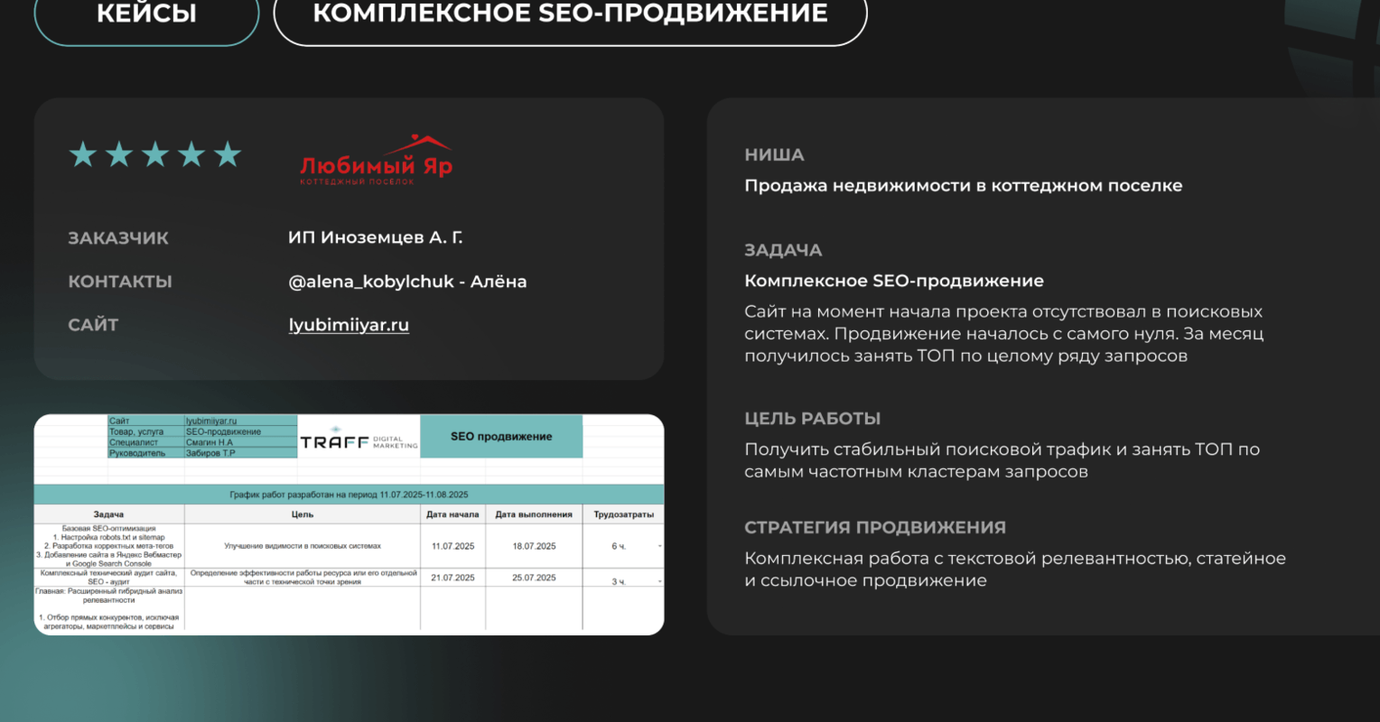 По итогам работ сайт закрепился в топе поисковой выдачи Google и Яндекс, что подтверждается устойчивым трафиком и отсутствием резких колебаний.