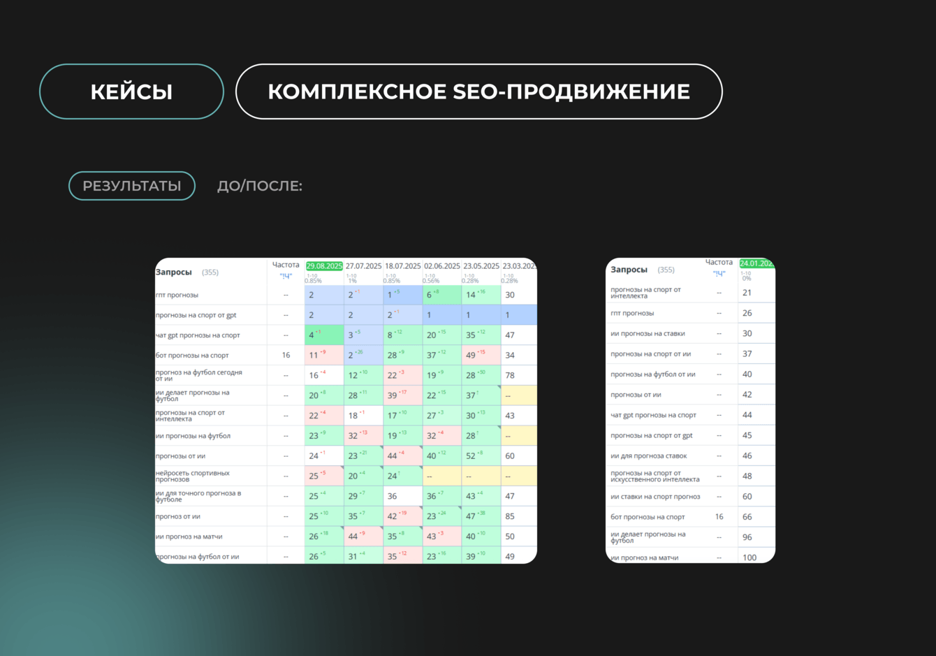 За девять месяцев удалось вывести сайт в ТОП-10 Яндекса и GOOGLE по целевым ключевым запросам, связанным с прогнозами на спортивные события от гпт.