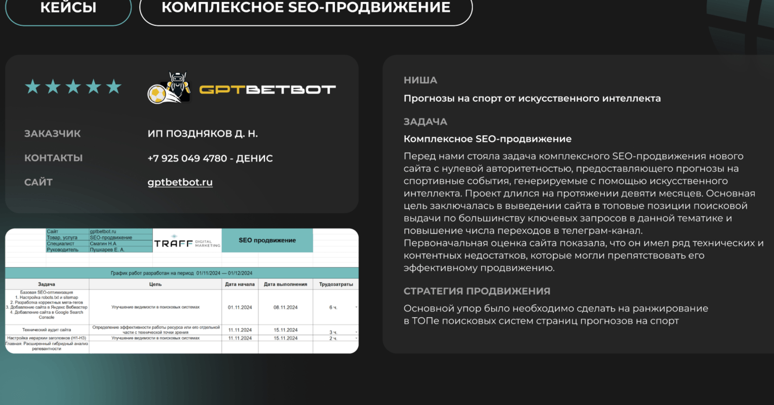 За девять месяцев удалось вывести сайт в ТОП-10 Яндекса и GOOGLE по целевым ключевым запросам, связанным с прогнозами на спортивные события от гпт.