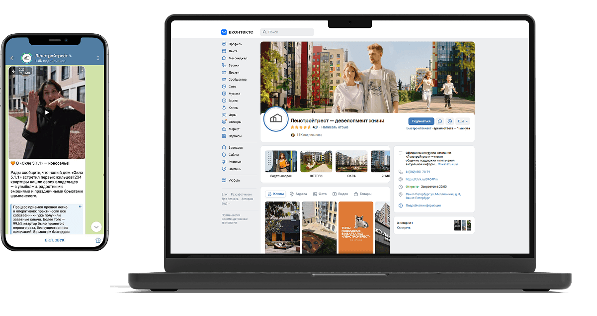 - ВКонтакте — выступал как лендинг о застройщике. Здесь размещалась самая свежая информация, новости компании.
