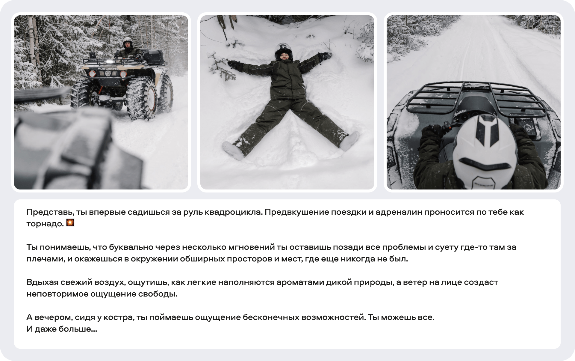 Что такое активный отдых? В первую очередь — это новые эмоции, незабываемые ощущения и адреналин. Поэтому при разработке контента мы делали акцент именно на эмоциональной составляющей. Человек, читающий пост, должен на 100% захотеть испытать эти эмоции.