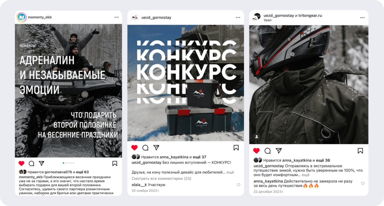 Помимо выхода постов мы запускали активации, конкурсы и коллаборации с брендом одежды для активного отдыха TRITON GEAR.