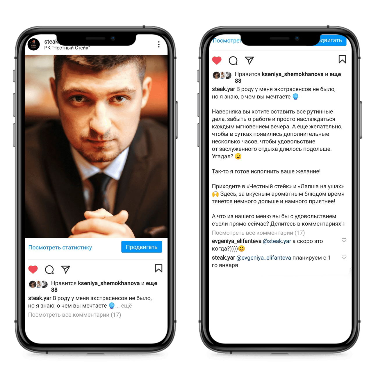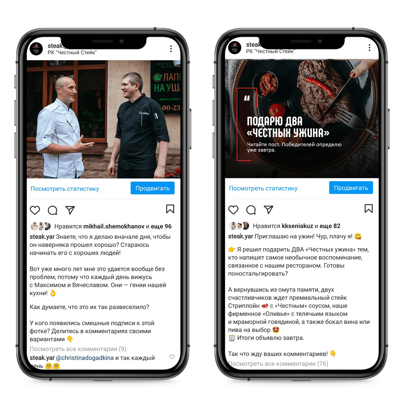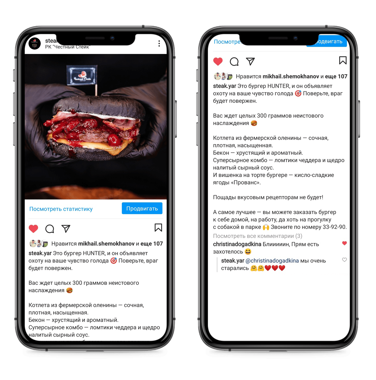 Так как Ресторанный комплекс «Честный Стейк» очень известное заведение Ярославля и о нём знает больший процент города, задача стояла не сколько увеличить число подписчиков или получить клиентов здесь и сейчас, сколько максимально охватить аудиторию Ярославля, проинформировать жителей города о скидках, новинках и других предложениях ресторанного комплекса, напомнить о себе.