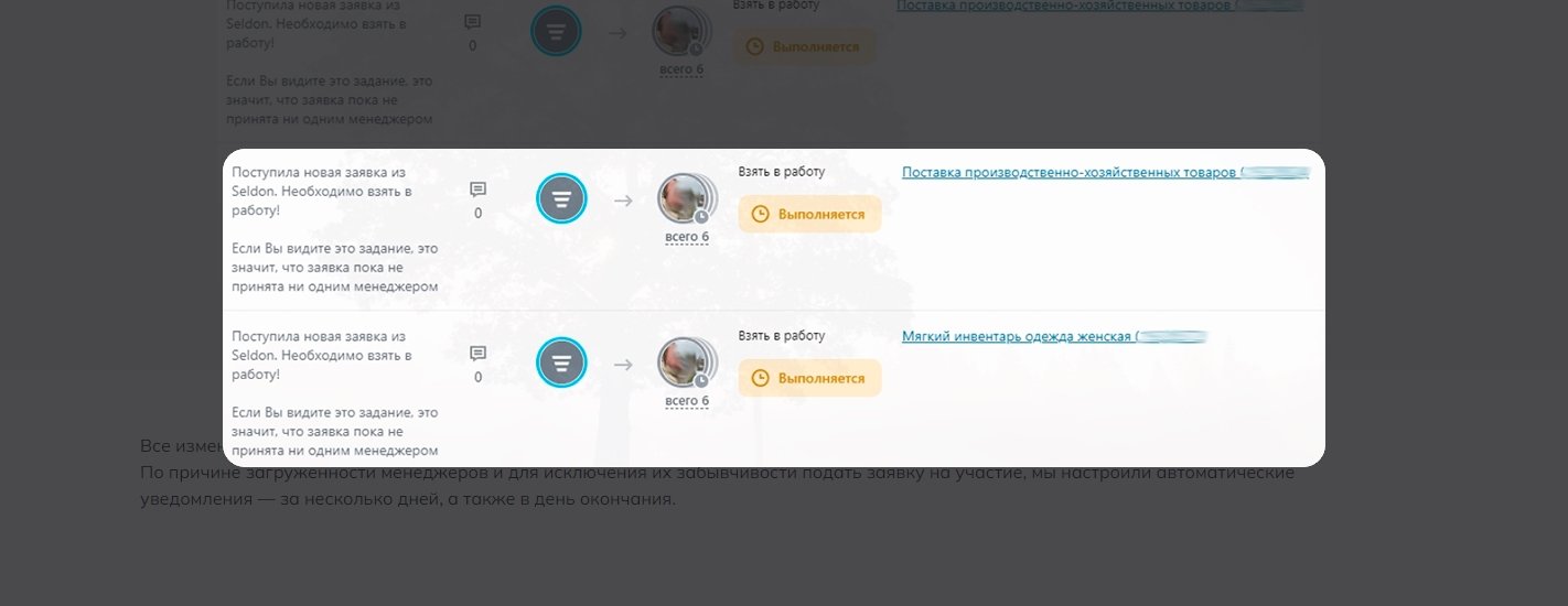 Менеджеры тендерного отдела теперь получают заявки ежедневно автоматически из Seldon. Они видят все новые заявки в Битрикс24 и сами отбирают для себя подходящие, берут в работу по регламенту «кто первый взял».