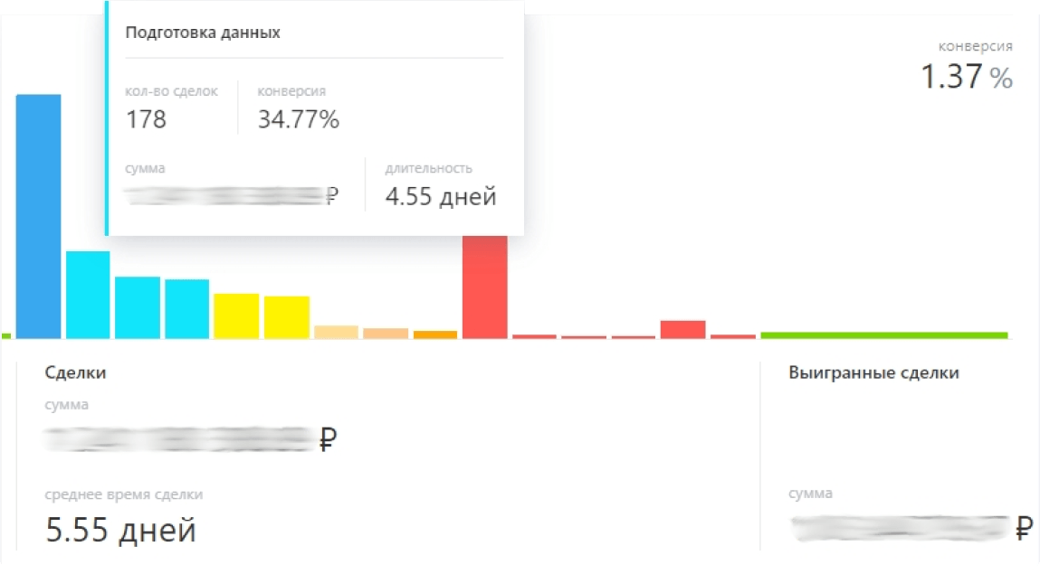 Удобный отчет по конверсии позволяет руководителям оценить количество дошедших до продажи сделок, проработать ошибки менеджеров и улучшить таким образом качество работы с клиентом.