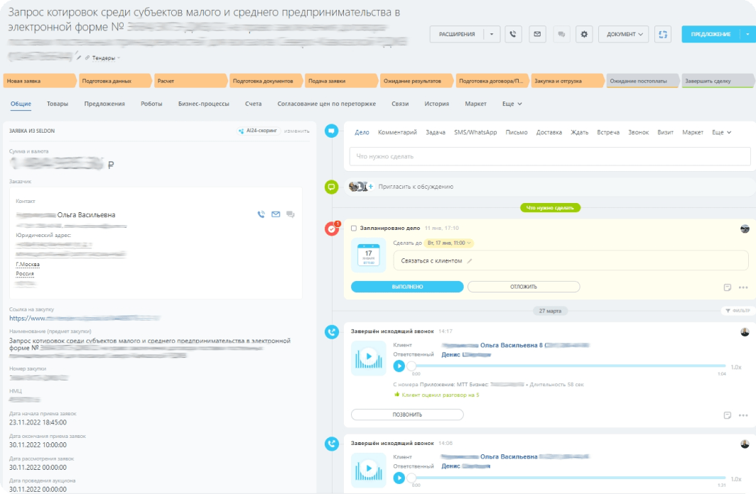 Все изменения по тендерной заявке со стороны Seldon автоматически приходят в карточку Битрикс24 и уведомлением менеджеру.