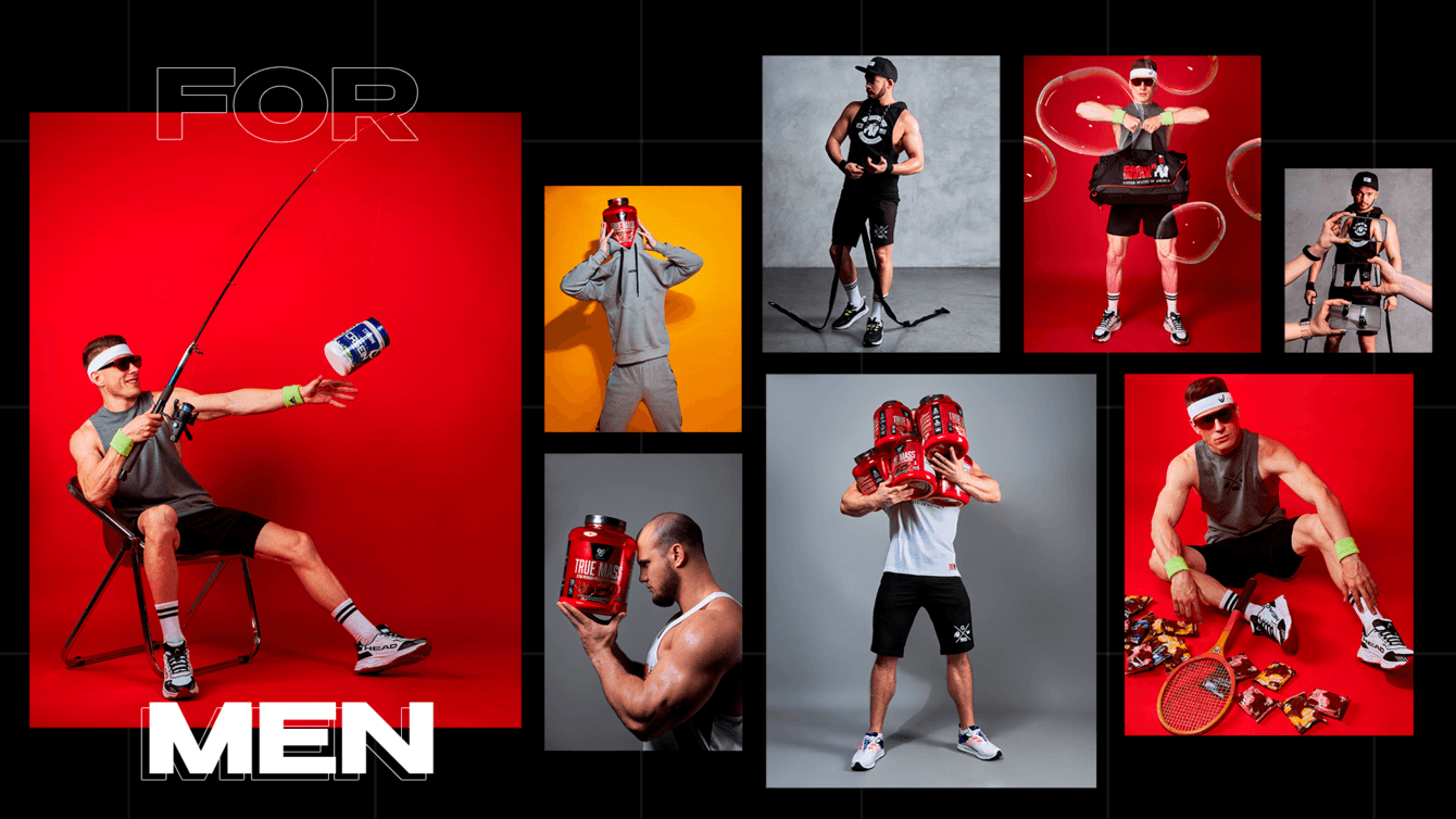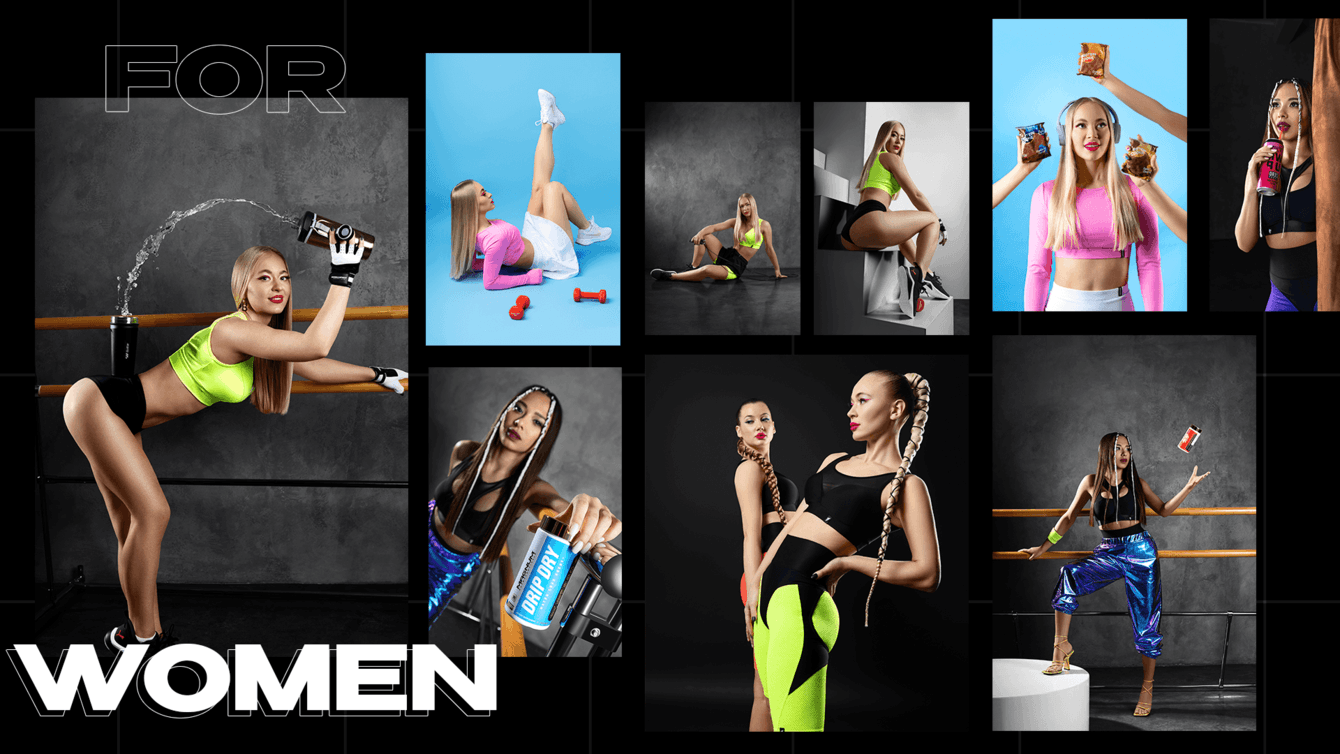 • Придумали креативную концепцию и провели три фотосессии: с фитнес-моделями мужчинами и женщинами в одежде из магазина, а также предметную съемку спортпита;