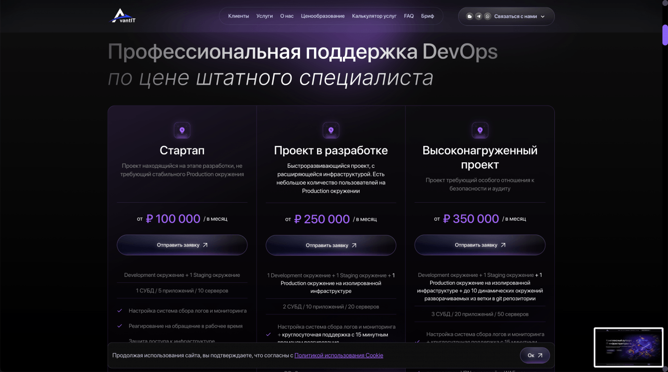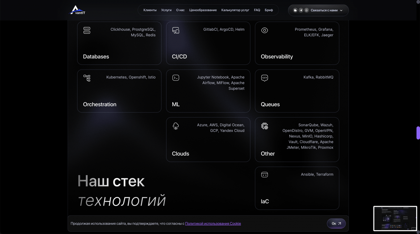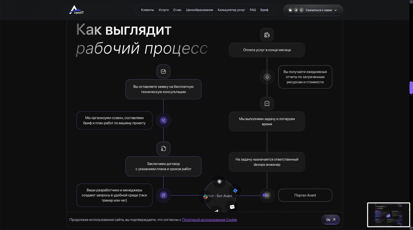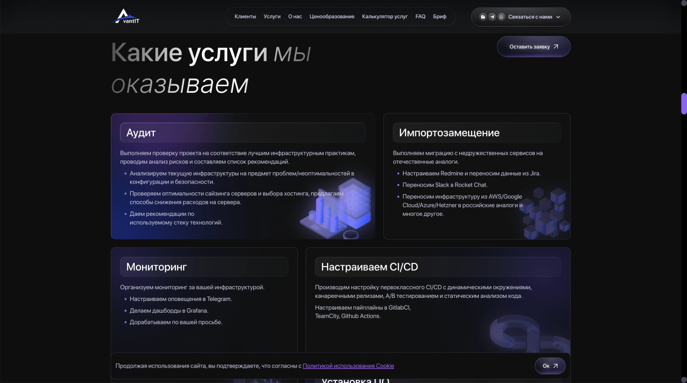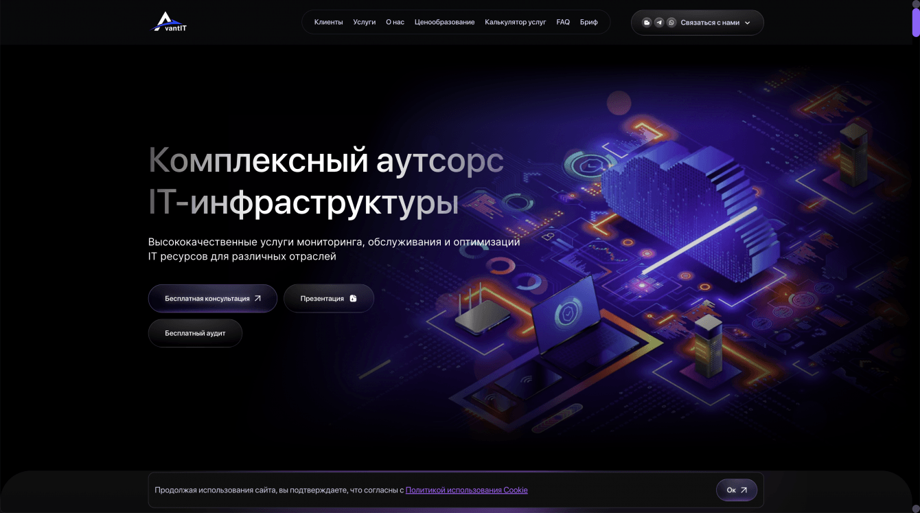 Для компании Avant IT была поставлена задача создать сайт, который будет не только представлять компанию как современного и надежного игрока на рынке IT-услуг, но и обеспечивать удобство для пользователей, повысив эффективность коммуникации с клиентами. Сайт должен был быть адаптирован для разных устройств и обеспечивать высокую конверсию, эффективно представлять портфель услуг и решения компании, а также стать удобной платформой для потенциальных клиентов.