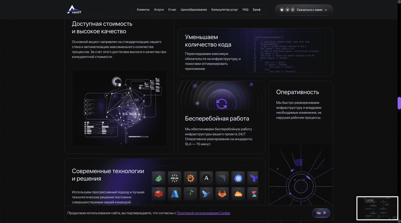 Для компании Avant IT было разработано решение, которое отвечало всем ключевым требованиям бизнеса и потребностям целевой аудитории. Сайт был создан с акцентом на современный и профессиональный дизайн, который не только подчеркивает инновационный подход компании, но и способствует формированию доверия у потенциальных клиентов.