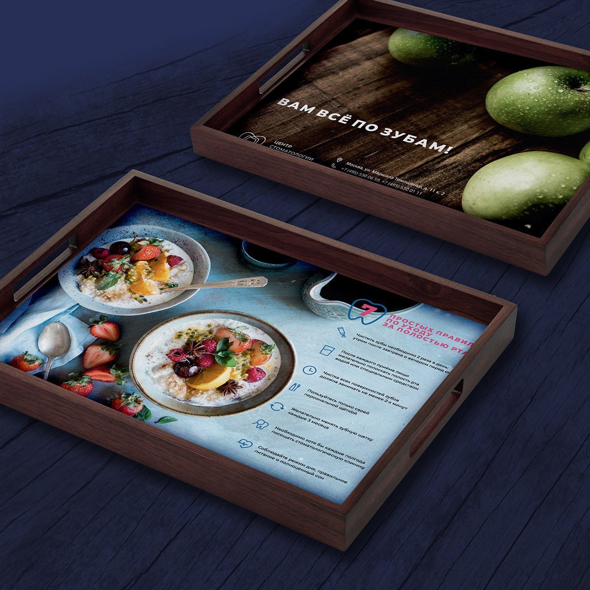 Проведено масштабное обновление фирменного стиля "Центра стоматологии и дентальной имплантации" ЦКБ Управления делами Президента РФ. Ребрендинг затронул логотип, фирменный стиль и различные рекламные и навигационные материалы отделения. В агентстве разработано множество информационных листовок-памяток для посетителей и настенных постеров для оформления зоны ожидания. А для кафетерия ЦКБ разработаны специальные подложки на подносы с памятками по уходу за полостью рта.