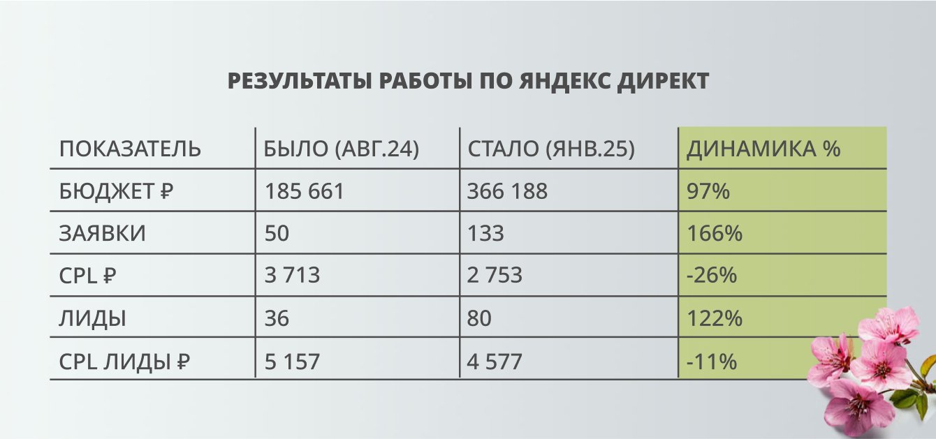 Сначала мы создали лендинг и запустили контекстную рекламу, позже занялись SEO-оптимизацией. Продвижение шло накопительным эффектом: проект постепенно набирал обороты, аудитория узнавала о нем, бюджет на Яндекс Директ увеличивали — поток заявок и лидов стабильно рос.