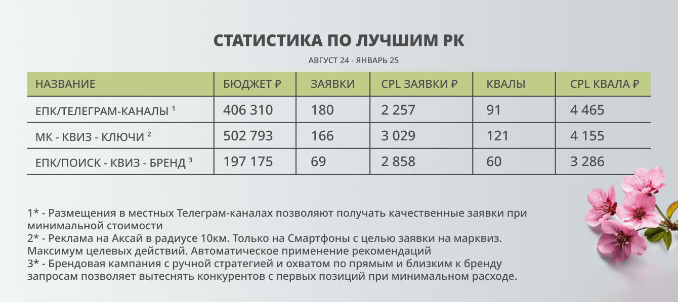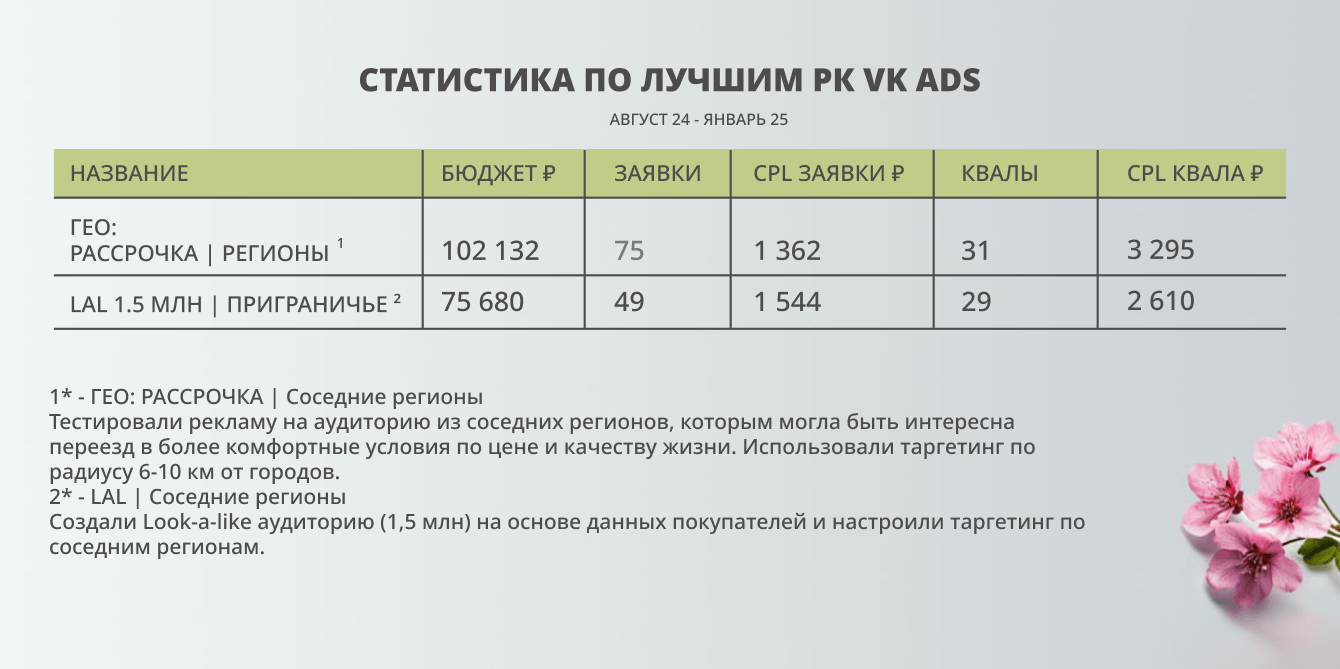 Ключевая особенность этого кейса — в оценке эффективности не по количеству заявок, а по квалифицированным* отделом продаж лидам и, что наиболее важно, по фактическим продажам квартир в новостройке.