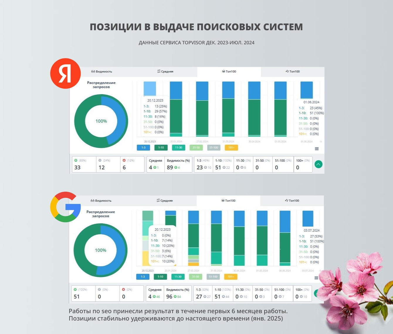 1. Рост позиций в поиске Яндекс и Google в начале работ и восстановление позиций к декабрю 2024 года после падения в июле.