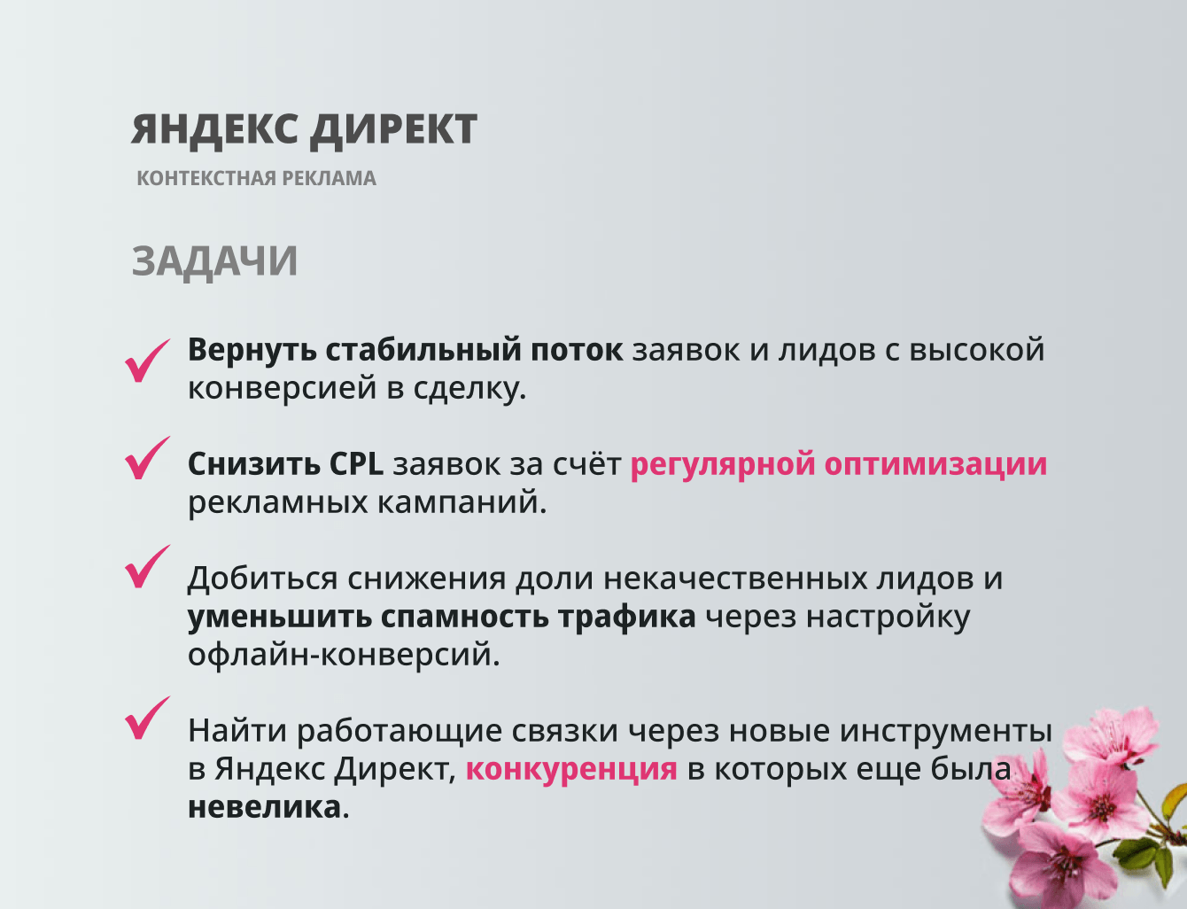1. Усилить рекламные кампании в Яндекс Директ, оптимизировать настройки и внедрить новые инструменты.