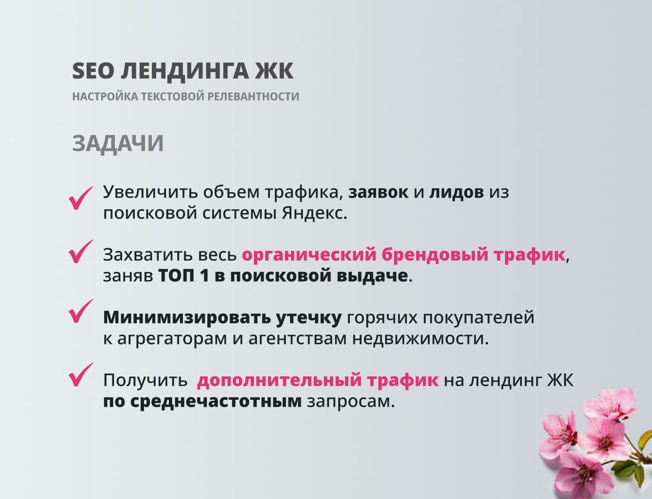 После создания сайта для ЖК «Вишневый сад» и запуска рекламных кампаний, маркетолог застройщика поставил новую цель: увеличить органический трафик, ведь именно он приносит самых горячих покупателей.