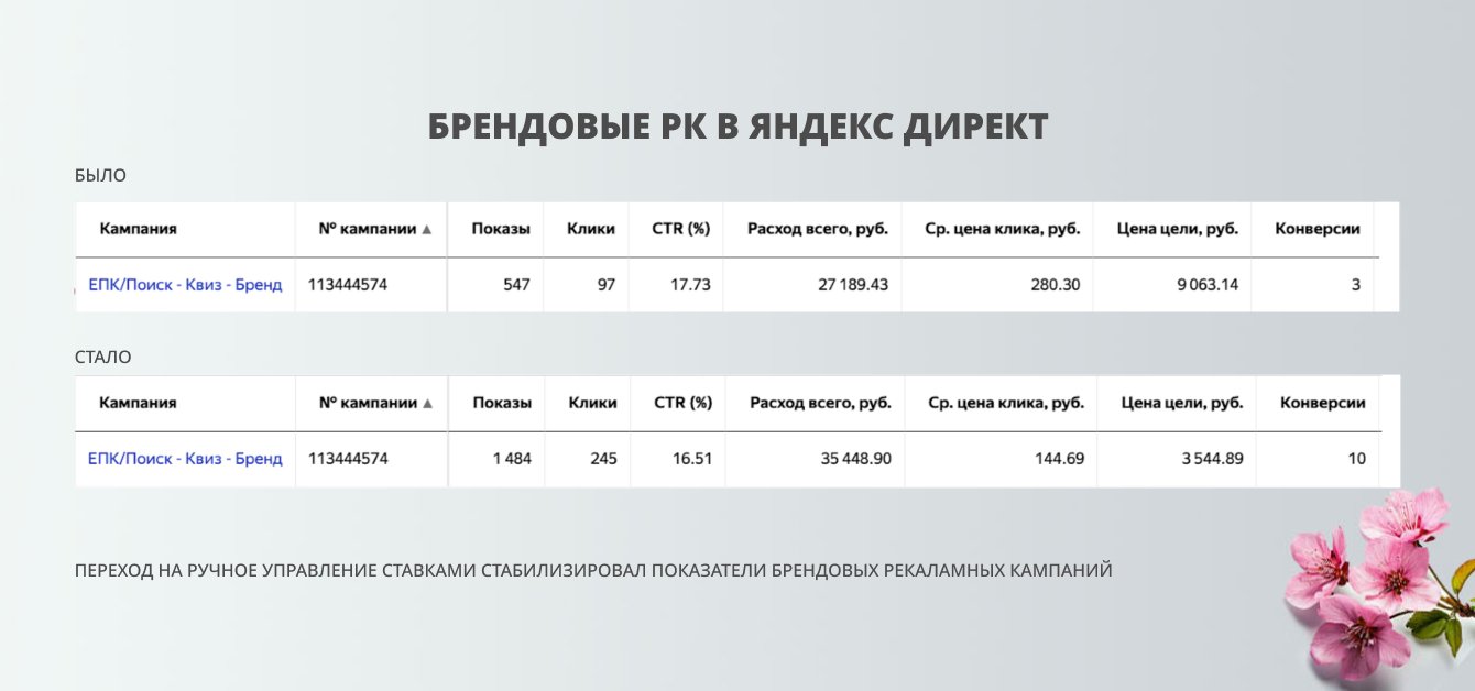 Переход на ручное управление ставками значительно улучил показатели по брендовым рекламным кампаниям.
