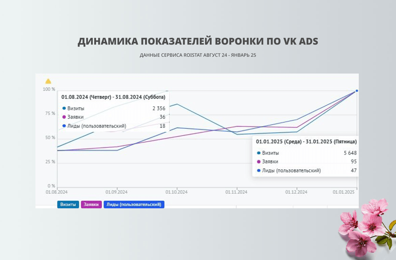 В результате за первый месяц работы нам удалось получить заявки и лиды в 1,5 раза дешевле, чем планировалось! Но мы не остановились на достигнутом результате и продолжали работать.