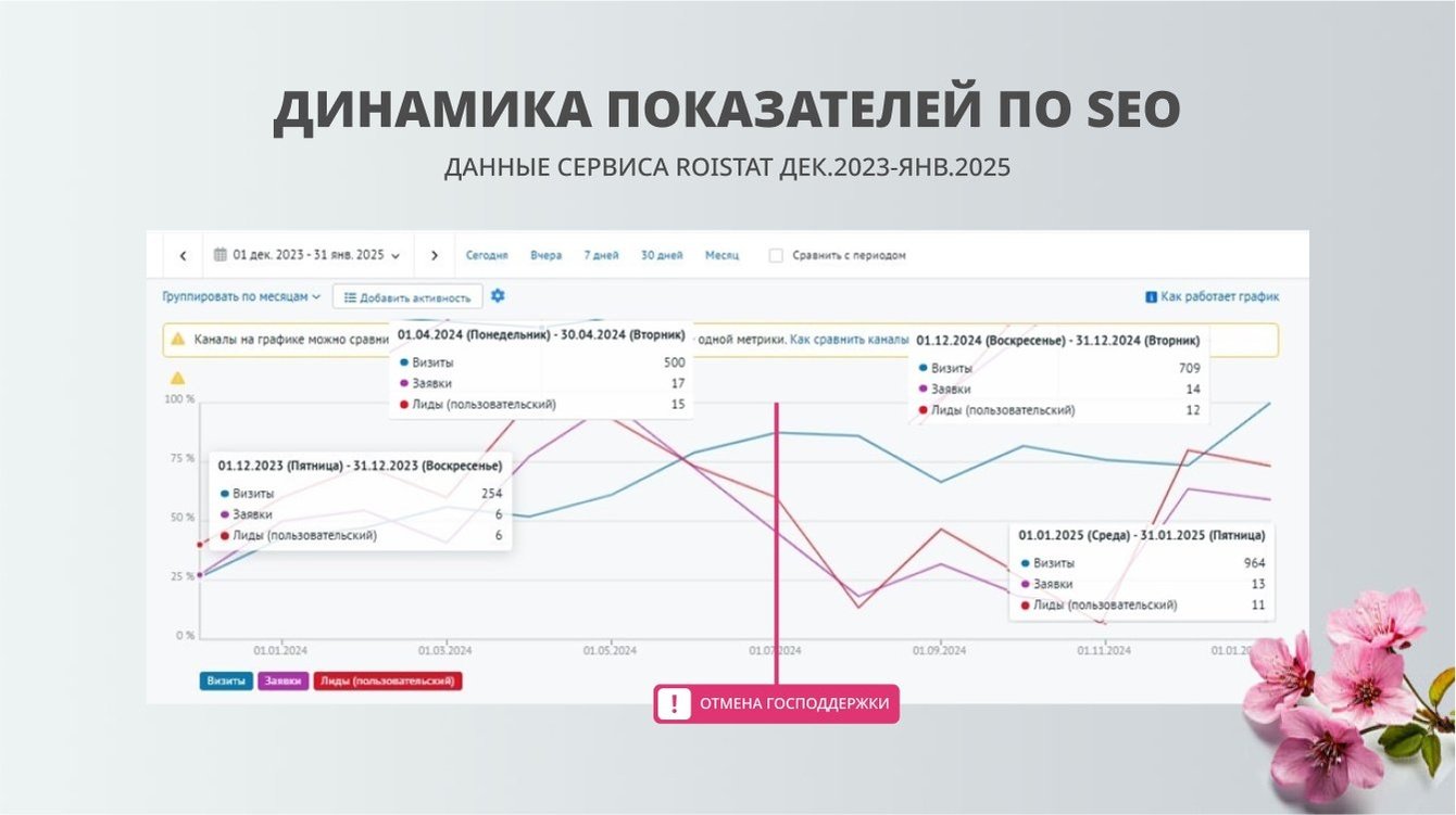 Было принято решение внедрить SEO, чтобы снизить общую стоимость заявок и повысить конверсию между этапами воронки маркетинга. Работы начали в декабре 2023 года.