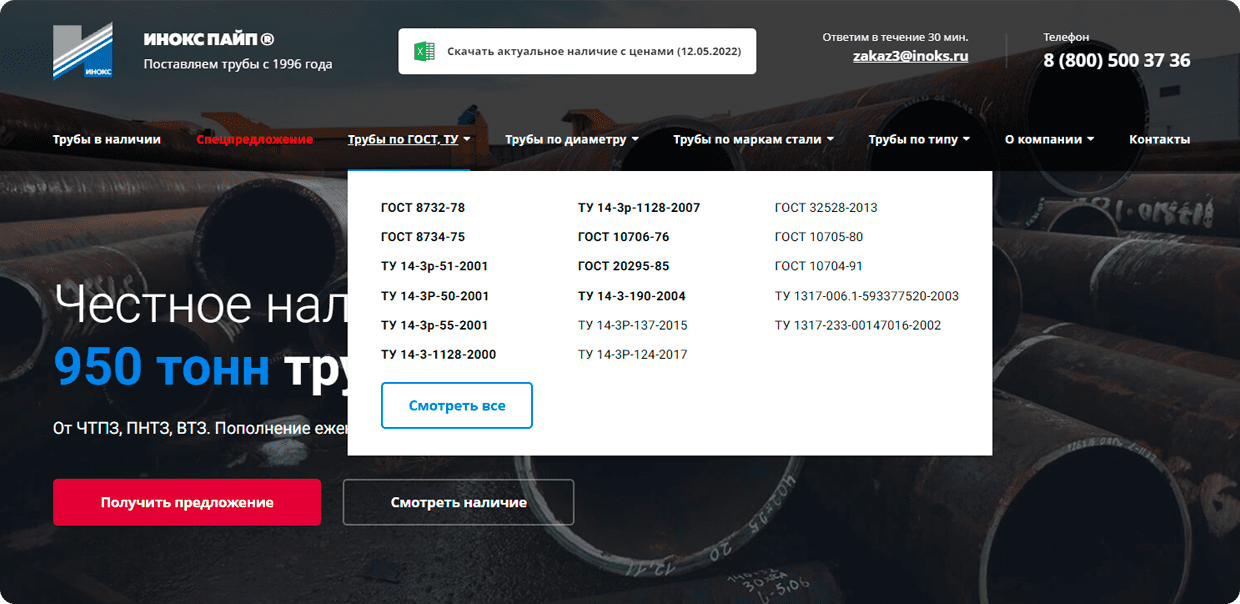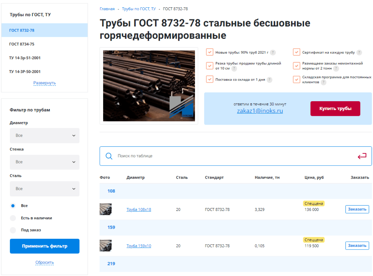 Это важно для SEO-продвижения, так с сайта не удаляются уже проиндексированные страницы труб, которых временно нет в наличии.