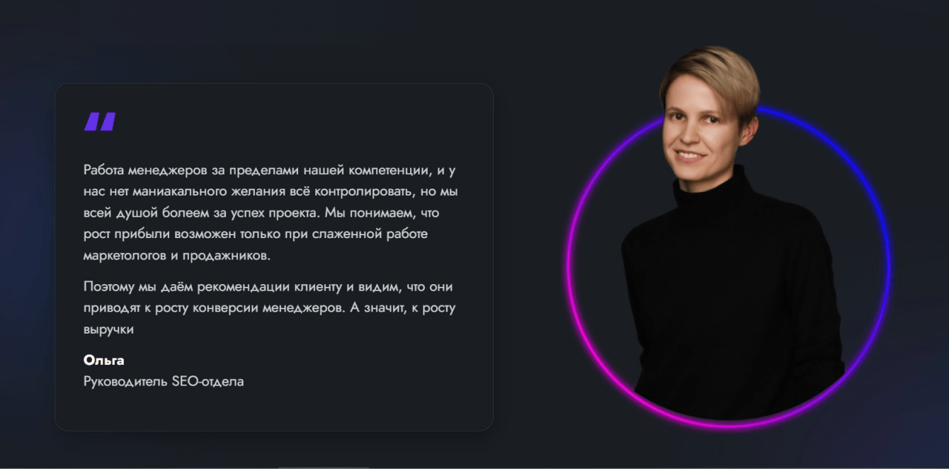 «Первое. Ваш подход отличается от других наших подрядчиков. Вы начали сотрудничество с диалога, с понимания фирмы и общей концепции бизнеса, как мы работаем и чего хотим. Второе. Вы определили стратегию, что мы хотим и как к этому прийти. Третье, что импонировало — шаги и конкретика.»