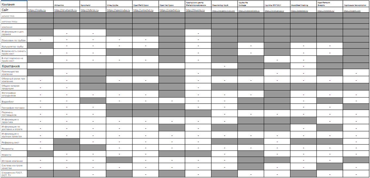 Мы сравнили 13 сайтов, которые нам предложил клиент и мы спарсили из топа поисковой выдачи. Провели анализ по 25 критериям.