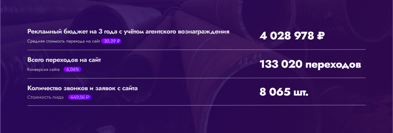 Увеличили посещаемость сайта до 4 636 посетителей, что при конверсии сайта в 6,64% дает 308 обращений в месяц.