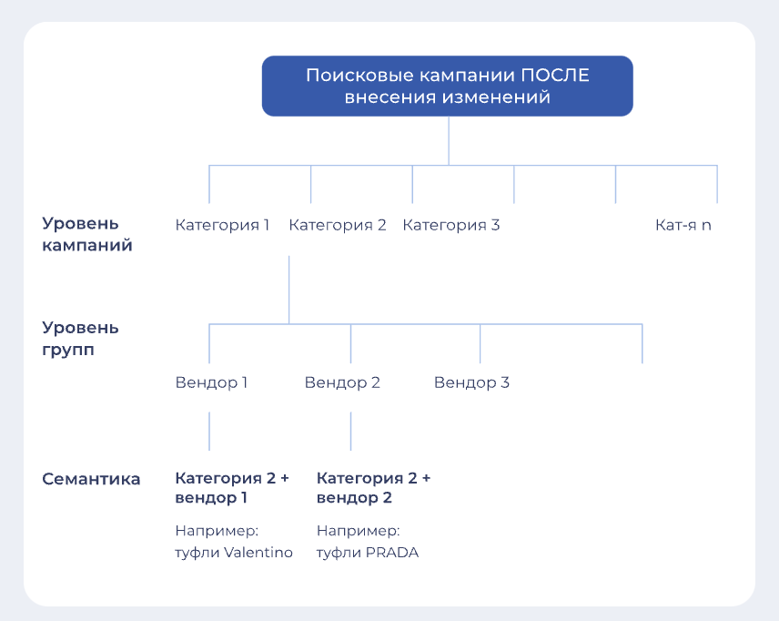 Мы изменили стратегию сбора кампаний и отбора ключевых слов в семантическое ядро. Сместили фокус с бренда на категорию товаров.