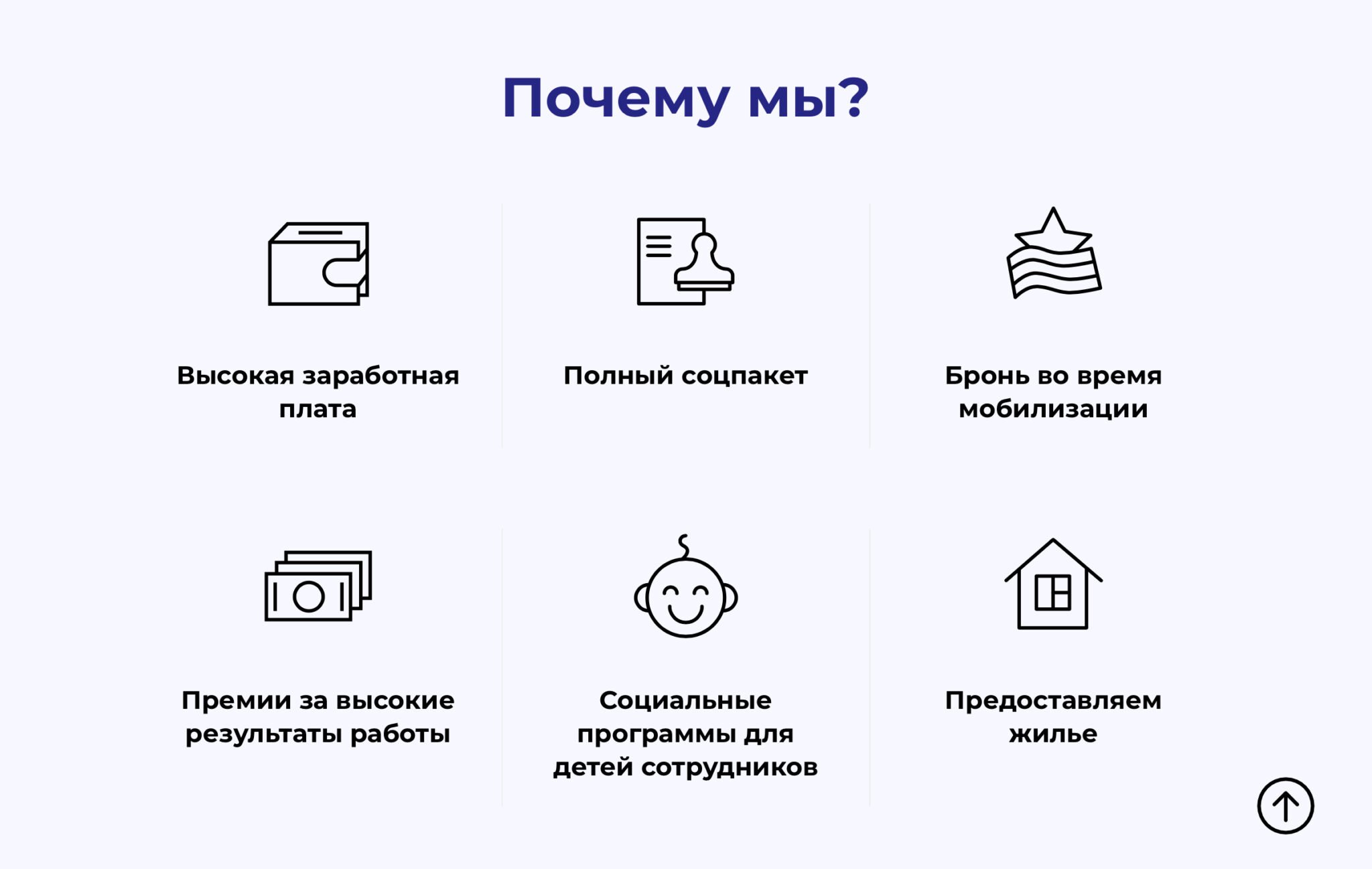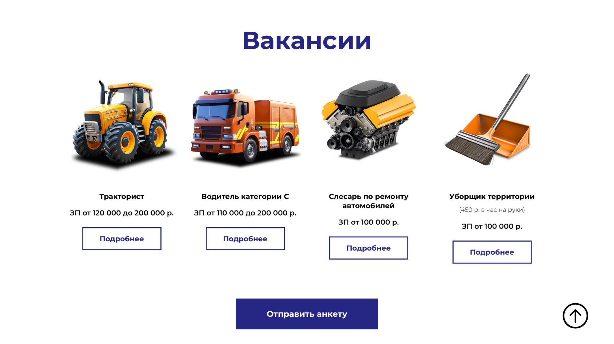 Сделали отдельный сайт с вакансиями для соискателей и сайт-визитку в Vk. Кратко рассказали о предприятии, сделали упор на преимущества работы, а также подробно расписали задачи и диапазон зарплат. Теперь информация о компании доступна, прозрачна и привлекательна для потенциальных сотрудников.