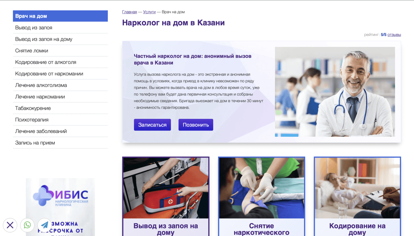 Заказчик – наркологическая клиника «Ибис», расположенная в Казани. Предлагает профессиональное лечение алкоголизма и наркомании. Медицинская организация состоит из двух структурных подразделений, которые обеспечивают полный цикл лечения зависимостей. Первый центр – наркологический, второй – реабилитационный.