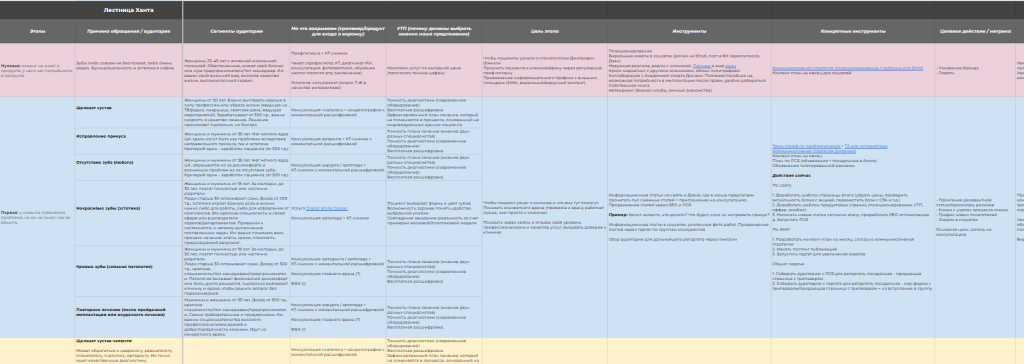 разработали CJM (карта пути клиента). Выделили сегменты аудитории, их боли и запросы. Подробно описали инструменты маркетинга и как их настроить, чтобы осознанно вести клиента от первого касания до визита в клинику;