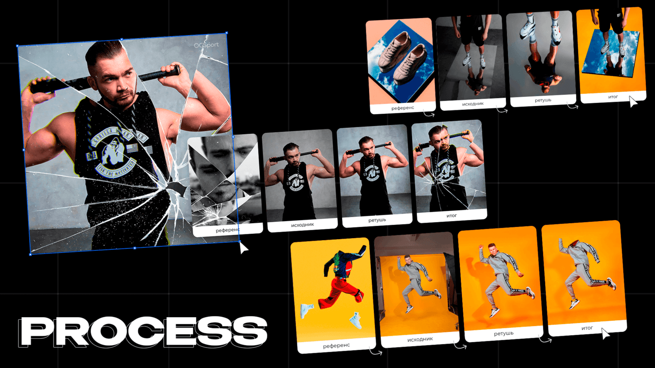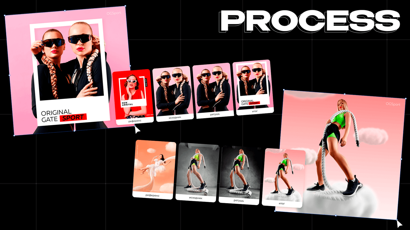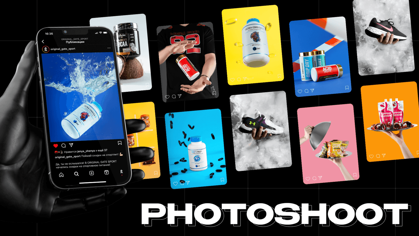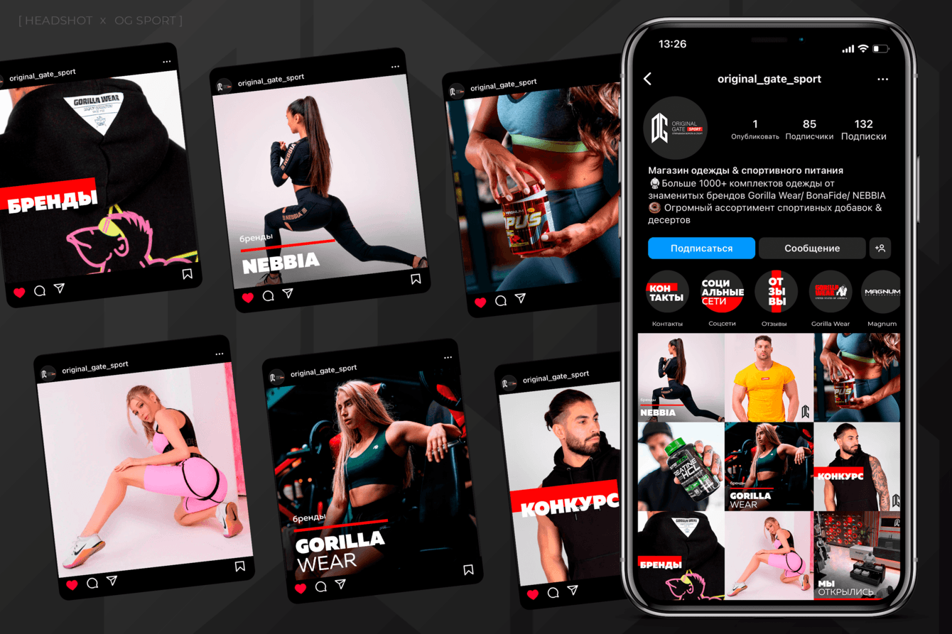• Придумали креативную концепцию и провели три фотосессии: с фитнес-моделями мужчинами и женщинами в одежде из магазина, а также предметную съемку спортпита;