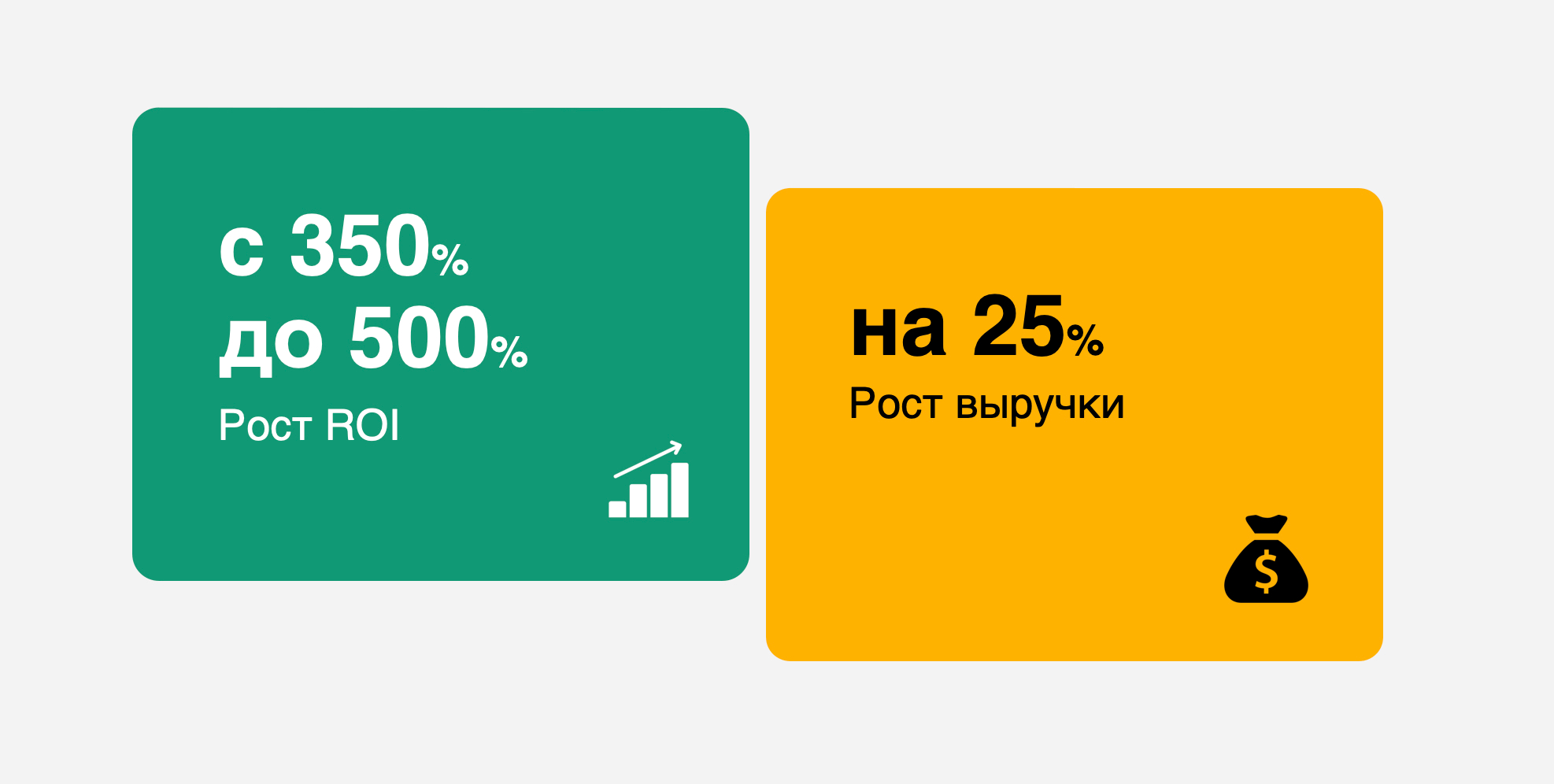 В результате проведенной работы удалось увеличить ROI относительно предыдущего года с 350% до 500%. При этом выручка поднялась на 25%. Заказчик более чем удовлетворен полученным результатом и продолжает сотрудничество с нами, будучи убежденным в том, что это решение намного эффективнее инхауса.
