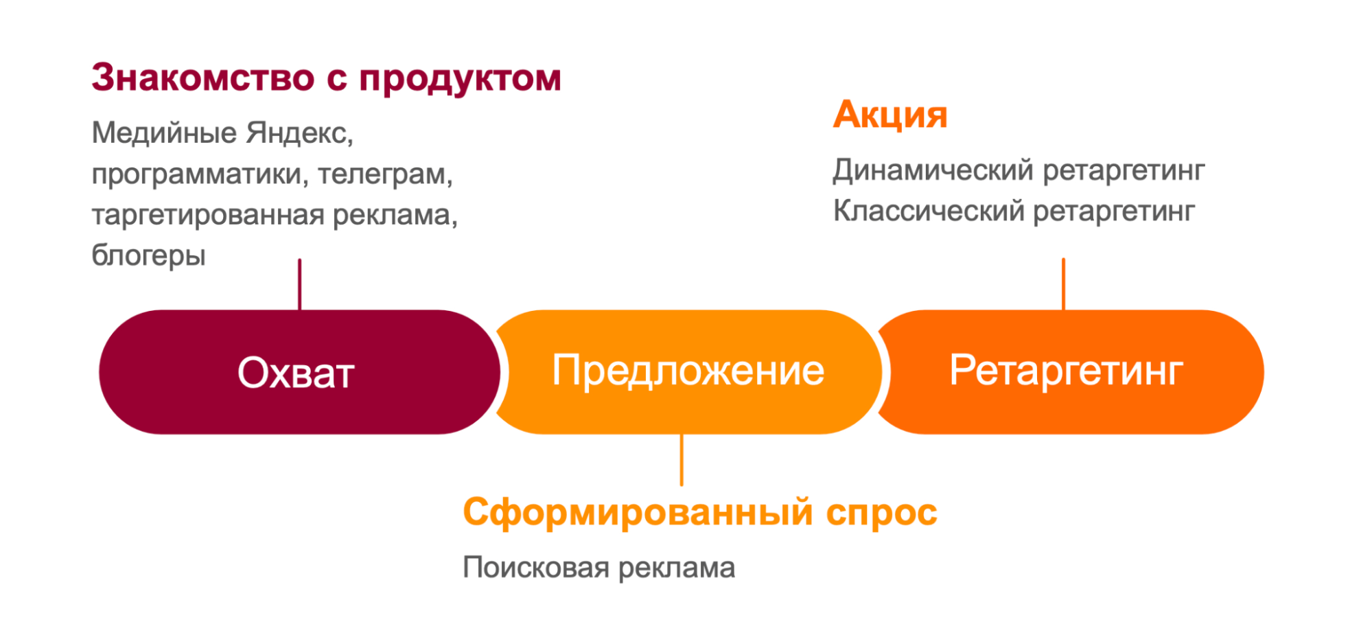 Учитывая амбициозные цели, заказчик изъявил готовность активно тестировать гипотезы и инвестировать в освоение новых каналов, поддерживая наши предложения. Это ключевое отличие от проектов, в которых заказчики требуют максимальную отдачу от каждого вложенного рубля, боясь проводить эксперименты и тем самым ограничивая используемые инструменты (в моменте это может давать высокие показатели ROMI и ДРР, однако негативно влияет на стратегическое развитие в будущем).
