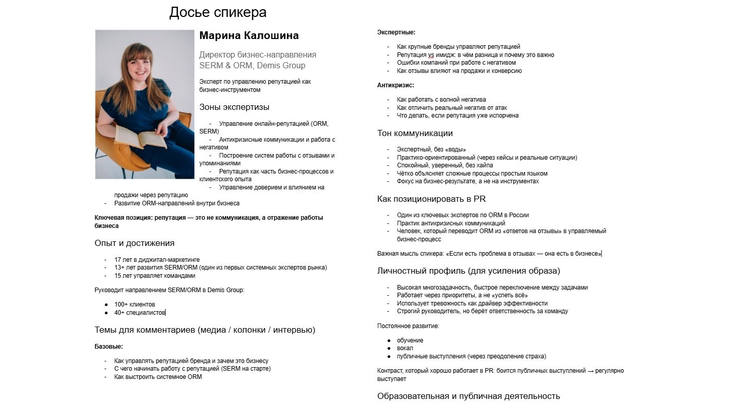 При этом важно понимать, что на этом этапе система только формировалась. Одним из первых решений стало формирование пресс-портретов экспертов. Команда собирала и структурировала информацию по каждому спикеру: