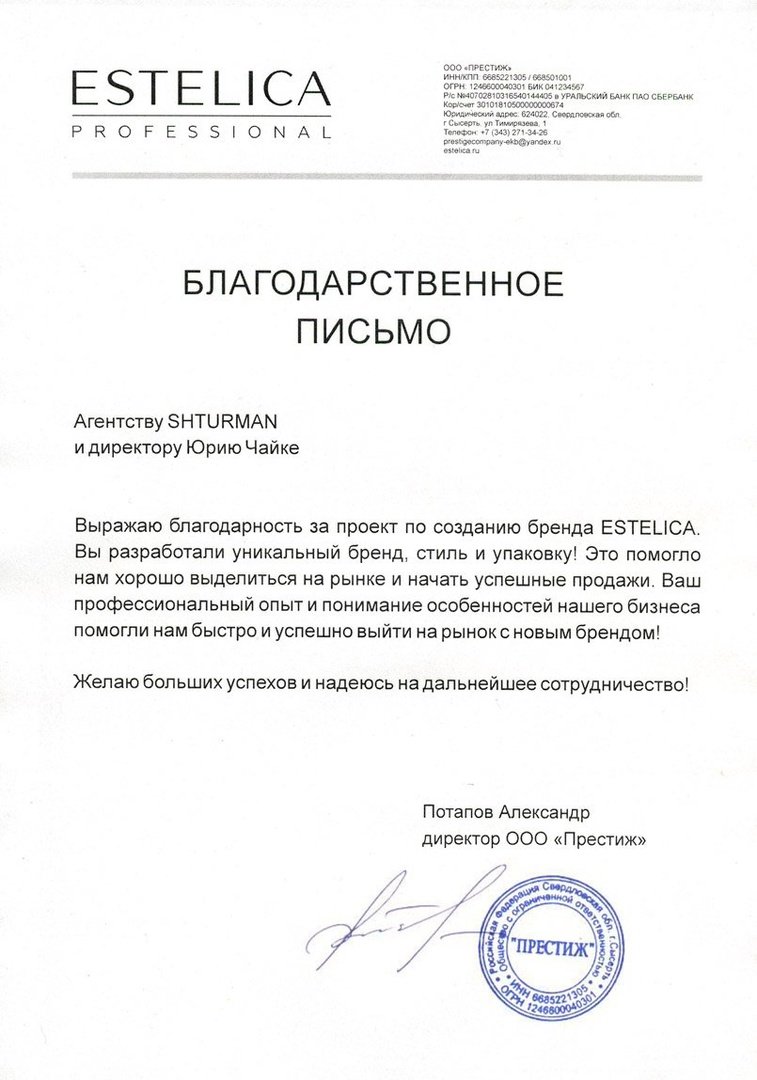 Выражаю благодарность агентству SHTURMAN за проект по созданию бренда ESTELICA. Вы разработали уникальный бренд, стиль и упаковку! Это помогло нам хорошо выделиться на рынке и начать успешные продажи. Ваш профессиональный опыт и понимание особенностей нашего бизнеса помогли нам быстро и успешно выйти на рынок с новым брендом!