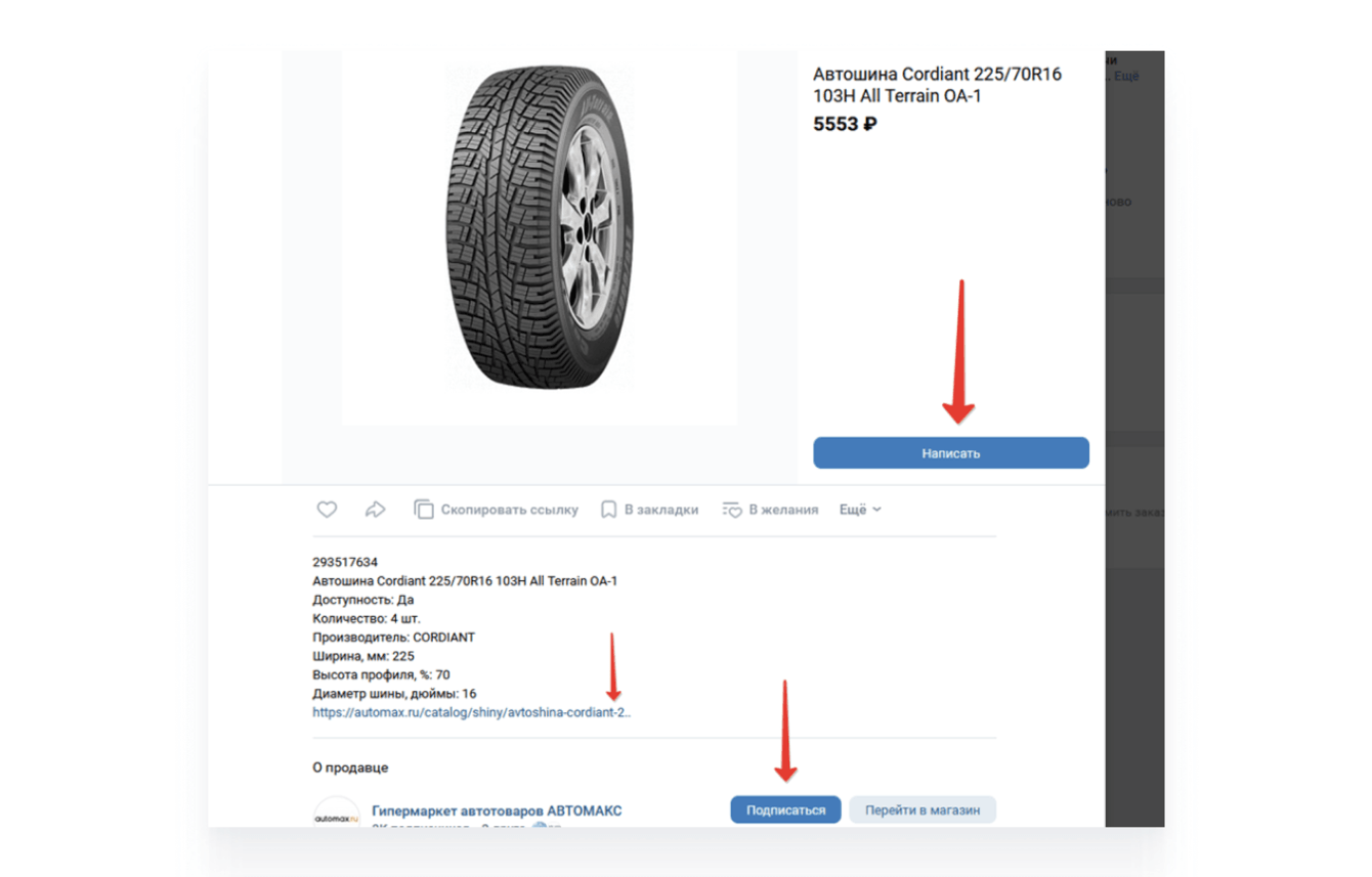 Каждая карточка имеет все необходимые конверсионные шаги: кнопка «Написать», по которой пользователь попадает в диалог с консультантом магазина, перейти на сайт и там уже сделать заказ, позвонить или написать в онлайн-чат и подписаться на сообщество.