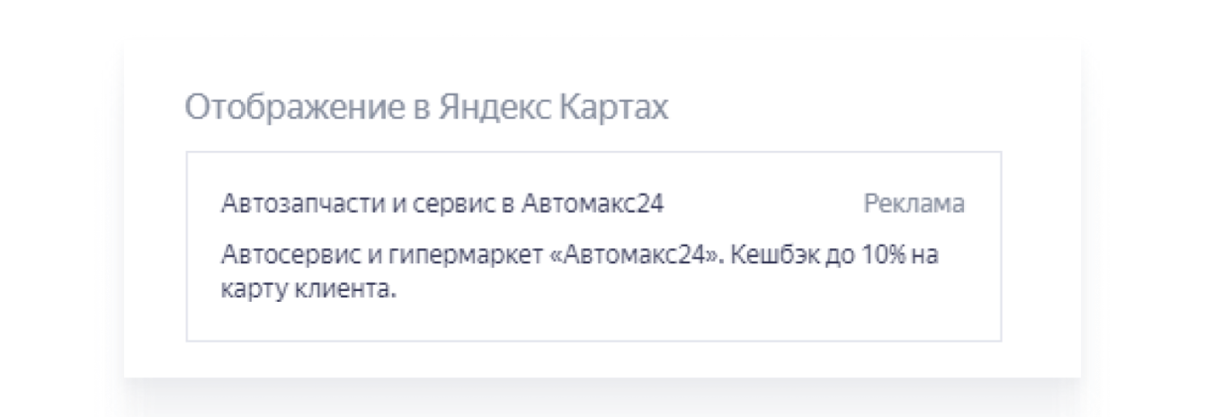 Размещение организации автотематики на Яндекс.Картах дает возможности дополнительных показов локальному бизнесу – у которого есть конкретный адрес в интересующем регионе.