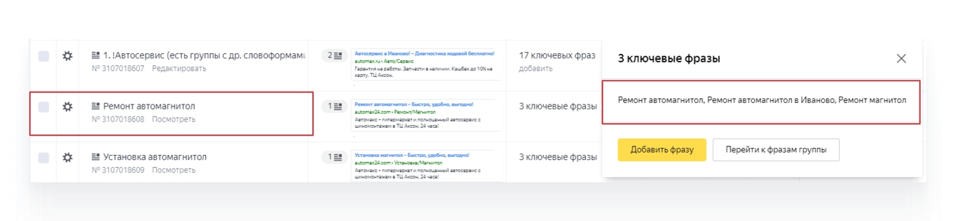 — Проработали запросы: разбили по группам, что-то наоборот объединили, при этом брендовые запросы вообще исключили. Составили список минус-фраз. Бренд добавили на уровне кампаний.
