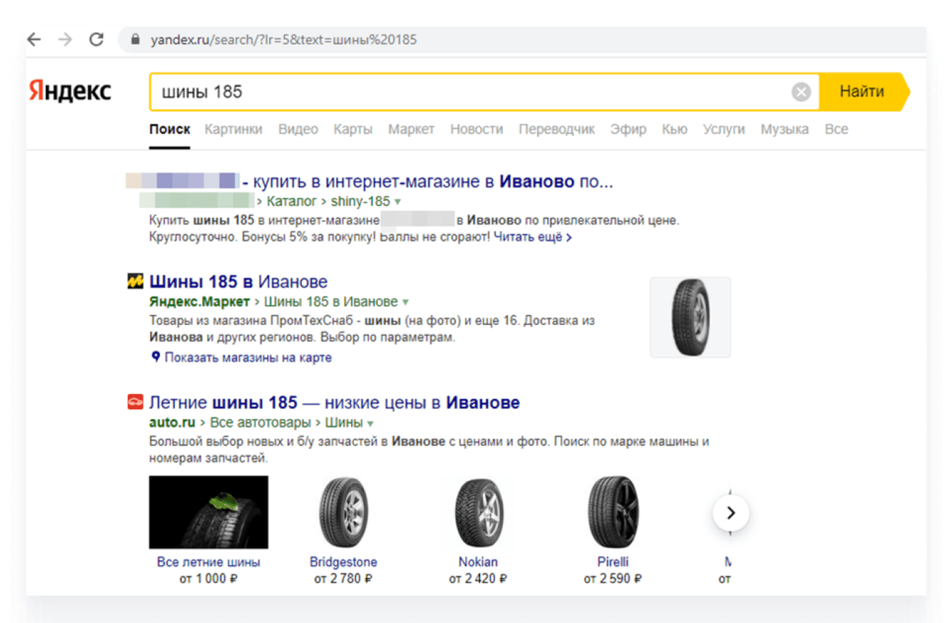 При этом такие страницы содержат уникальные мета-теги, заголовки, тексты, ЧПУ-адреса с вождением запроса, что позволяет им быть авторитетными и занимать топовые места в результатах поиска. Например, страница по шинами 185 мм в поиске Яндекса на 1 месте: