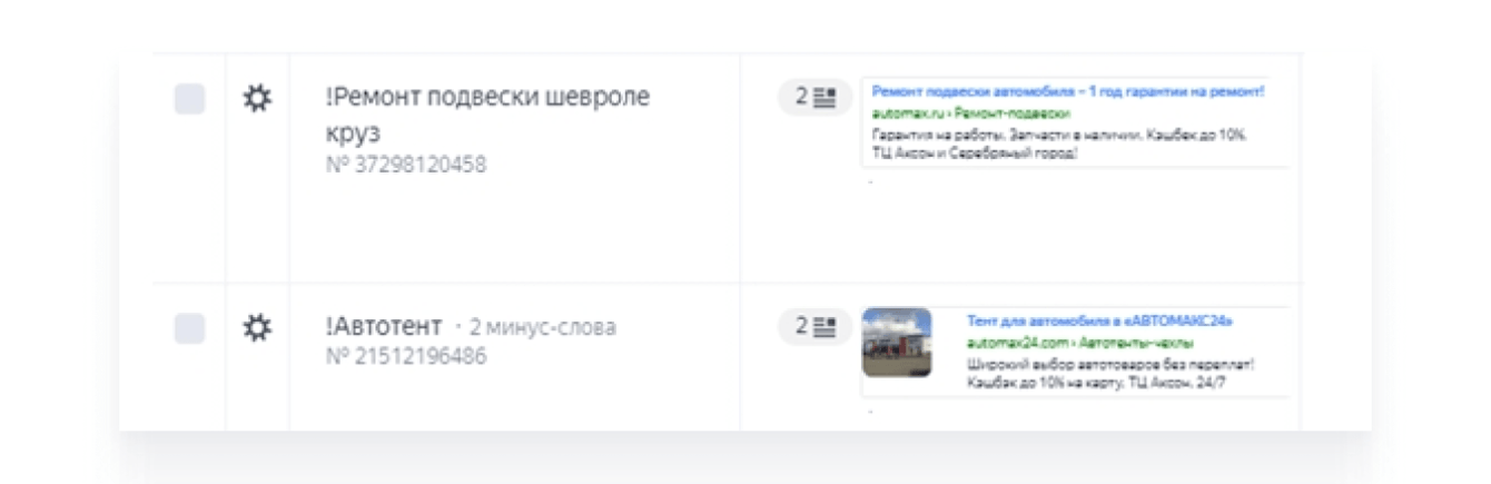 — В общих группах объявлений РСЯ (KMS) решили разместить фото самого магазина, а в тестах всех объявлений указывать название гипермаркета «Автомакс» с целью продвижения бренда.