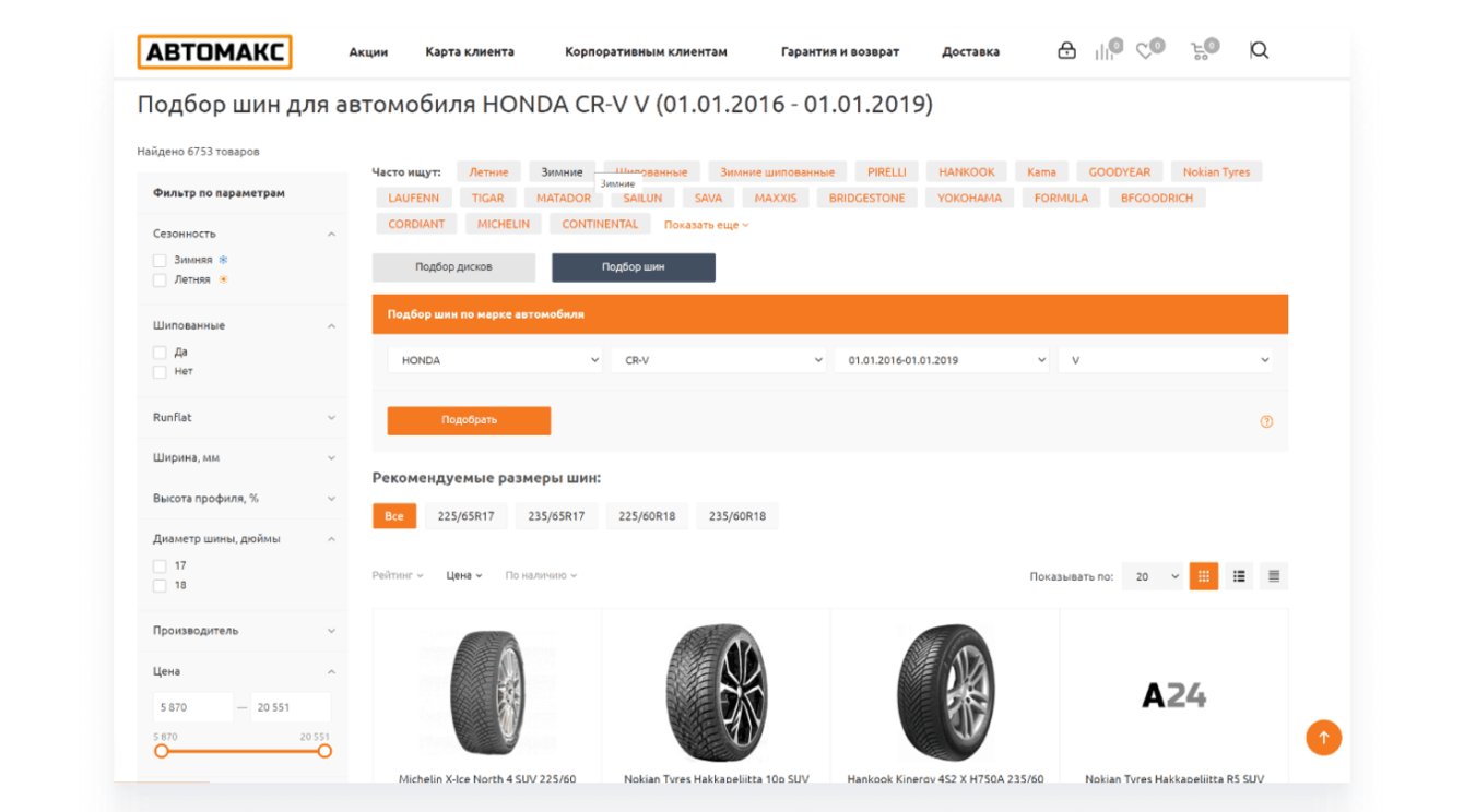 Для быстрого поиска подходящей резины посетителям не хватало возможности указать марку и модель своего авто и выбирать шины из подходящих по дополнительным параметрам, например, бренду или индексу скорости: