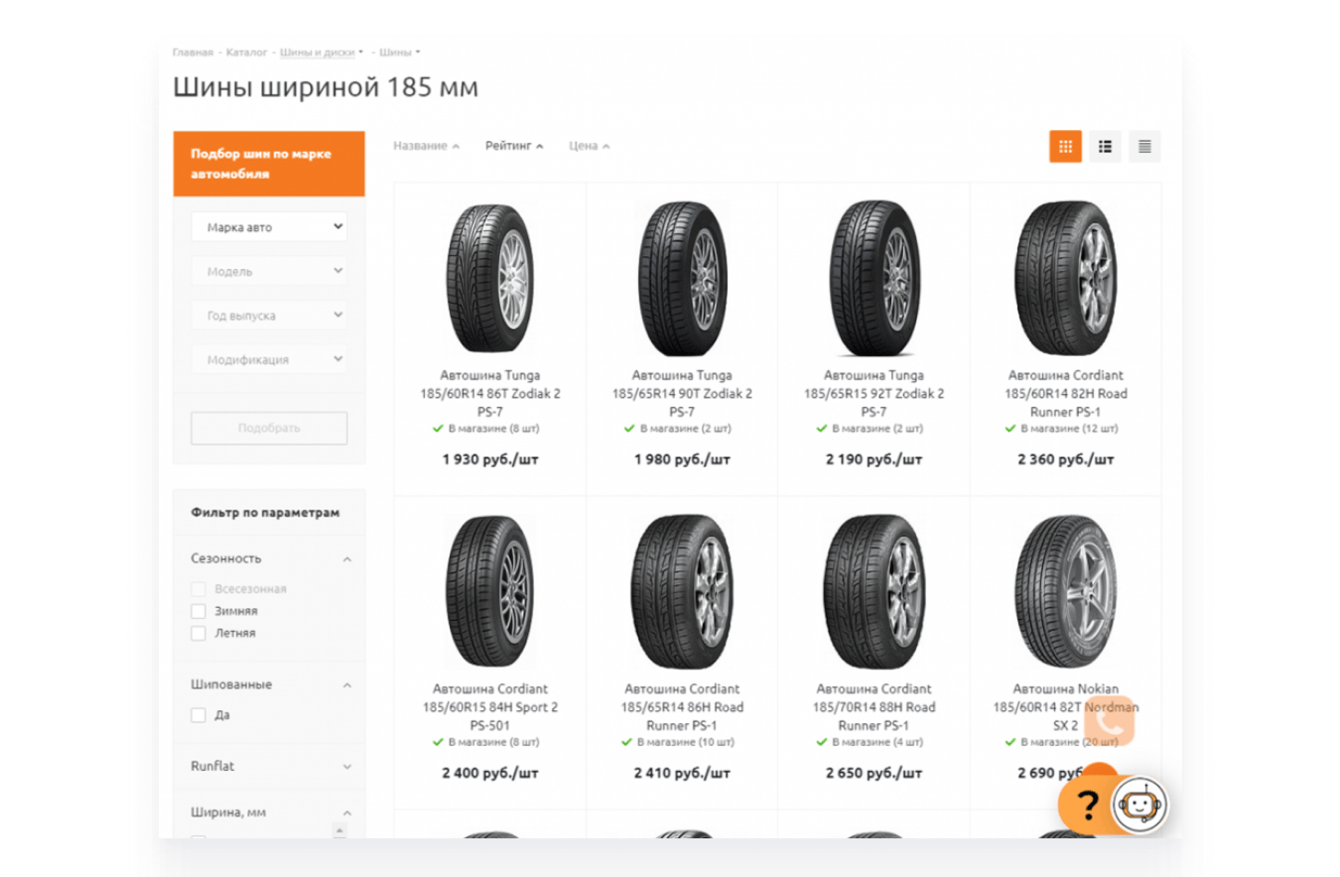 Например, часто люди ищут шины по размерам. У нас был только фильтр, в котором можно отобрать нужные товары, выбрав соответствующий параметр. С помощью инструмента "Автогенератор SEO умного фильтра" мы создали 800+ полноценных страниц (мы их называем псевдостраницы, т.к. их нет в основной структуре каталога) под нужные запросы.