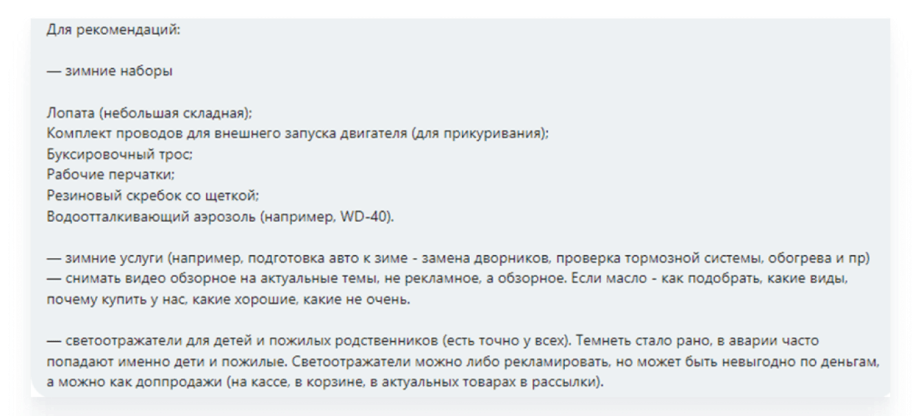 — Неочевидные запросы, синонимы (так ценимые поисковыми системами): стеклоочистители/дворники, шины/колёса, резина и пр.