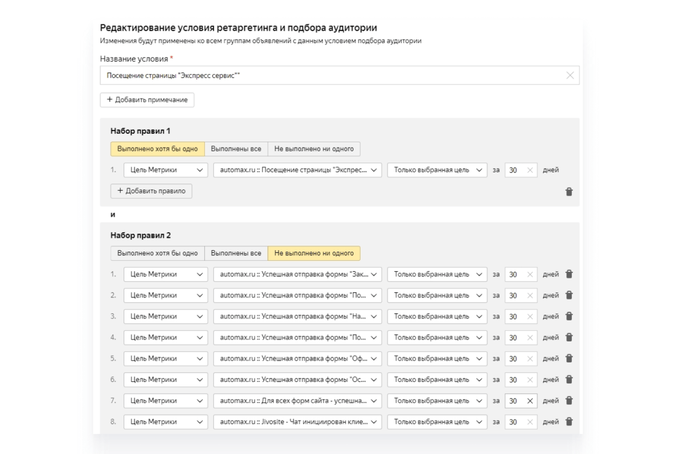 Создали вспомогательные цели для дальнейшей настройки ретаргетинга на посетителей по определенным условиям, например, «Посетили страницу «Экспресс-сервис» и не выполнили ни одного целевого действия».