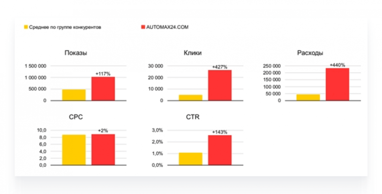 5. Привлекли в лучший месяц 6128 целевых визитов по цене 184 рублей из контекстной рекламы. В среднем за год (с учётом месяцев как высокого, так и низкого спроса) уложились в KPI, при этом по сравнению с конкурентами привлекли переходов на 427% больше при практически такой же стоимости перехода.