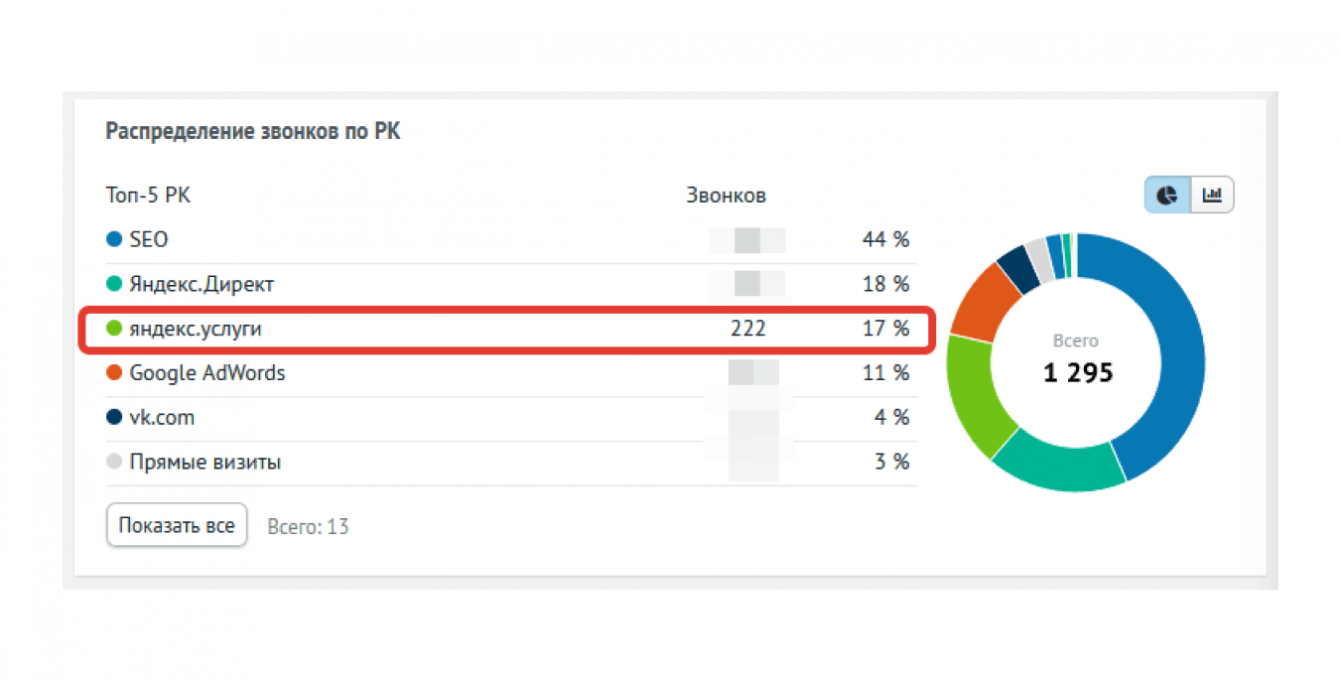Настроили колл-треккинг по основным источникам привлечения лидов: SEO, Яндекс.Директ, Google.Adwords, Яндекс.Услуги, ВКонтакте, Яндекс.Карты и прочее. Колл-треккинг особенно важен для таких источников звонков, где отсутствуют другие инструменты аналитики – например, Яндекс.Услуги.