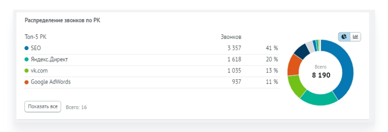 Настроили колл-треккинг по основным источникам привлечения лидов: SEO, Яндекс.Директ, Google.Adwords, Яндекс.Услуги, ВКонтакте, Яндекс.Карты и прочее. Колл-треккинг особенно важен для таких источников звонков, где отсутствуют другие инструменты аналитики – например, Яндекс.Услуги.