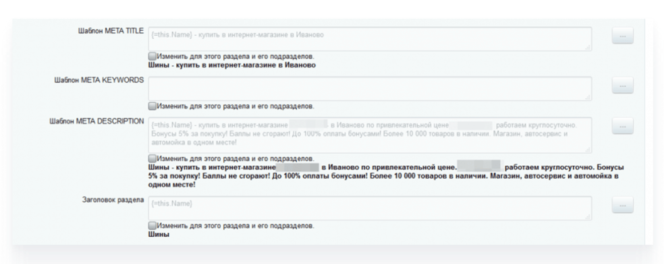 Прописали шаблоны мета-тегов, включающие коммерческие слова «купить», «цена», «интернет-магазин» и пр. Шаблоны позволяют автоматически добавлять необходимые мета-теги при создании страницы. Не нужно отслеживать новые страницы и прописывать мета-теги для каждой отдельно. И при этом у всех страниц – уникальные мета-теги title и description, что важно для поисковых систем.