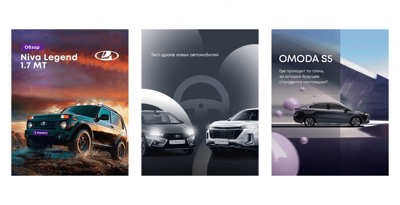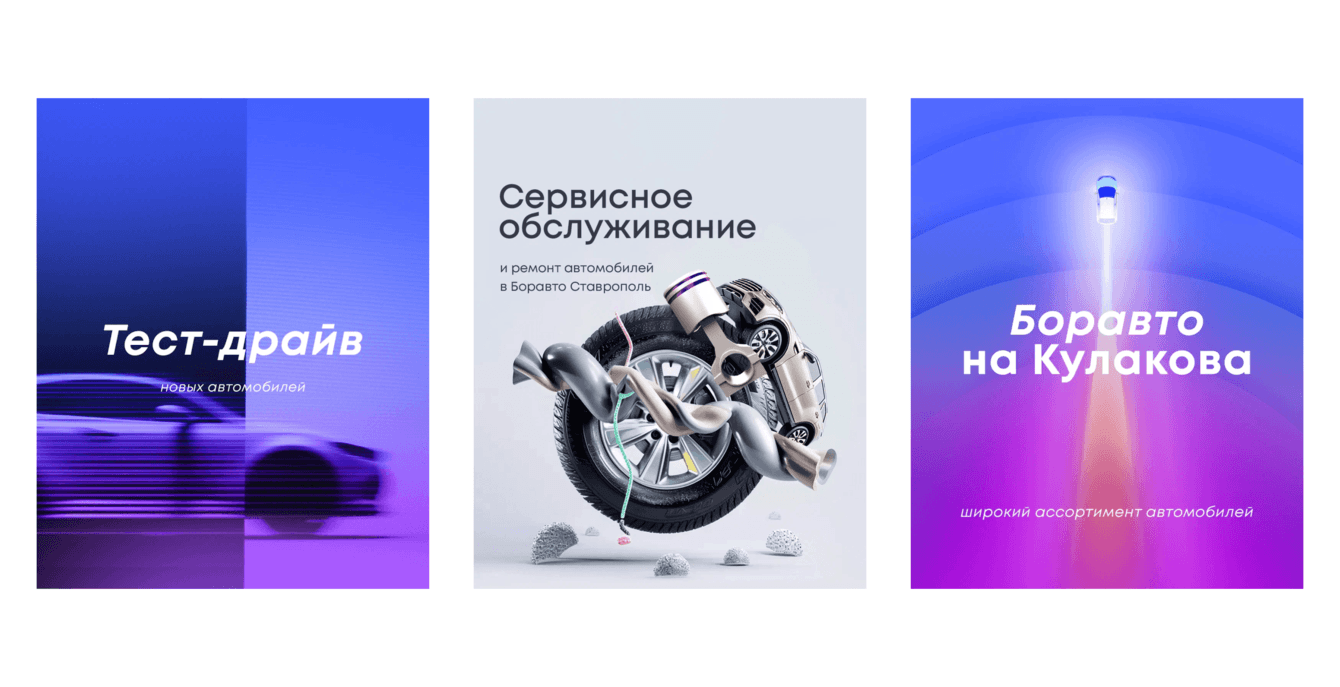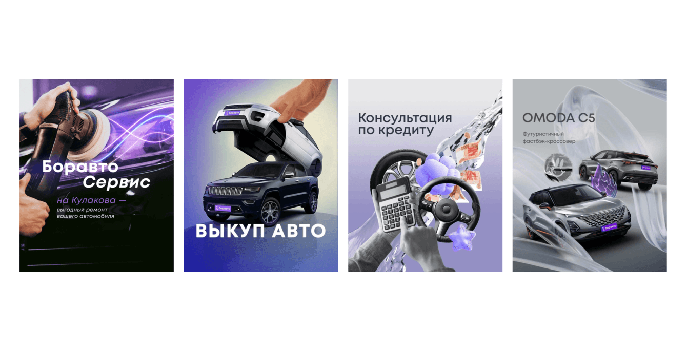 Для каждого ДЦ создали отдельный гайдлайн по оформлению визуальных материалов, с опорой на фирменный стиль общего бренда Боравто.