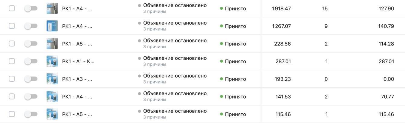 За время работы было разработано 10+ креативов. Протестировано 30+ объявлений на разные аудитории, каждая из которых, благодаря правильной проработке дала хороший результат.